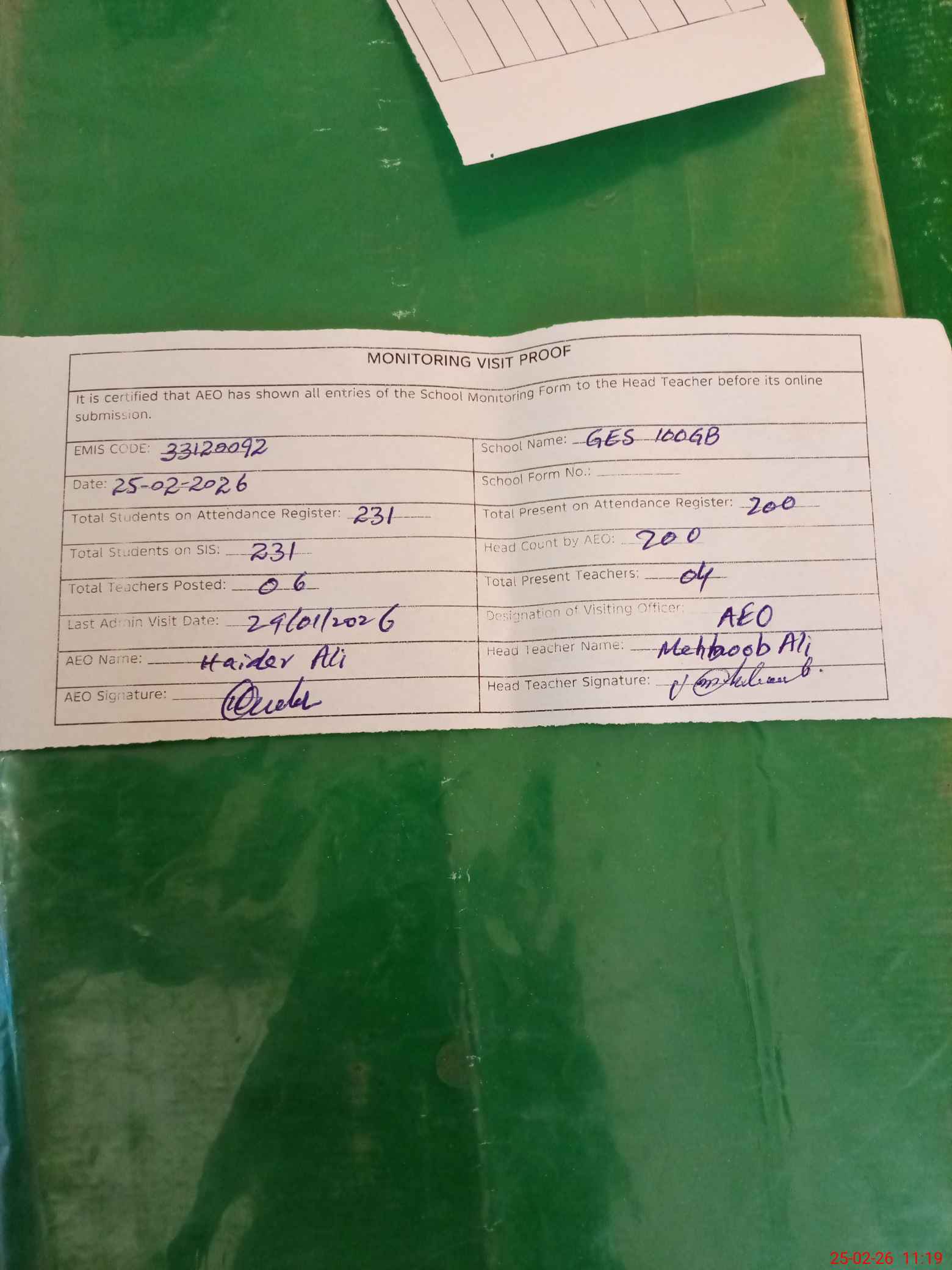 | Attendance Register | Head Teacher | MEA with School | Visit Proof |