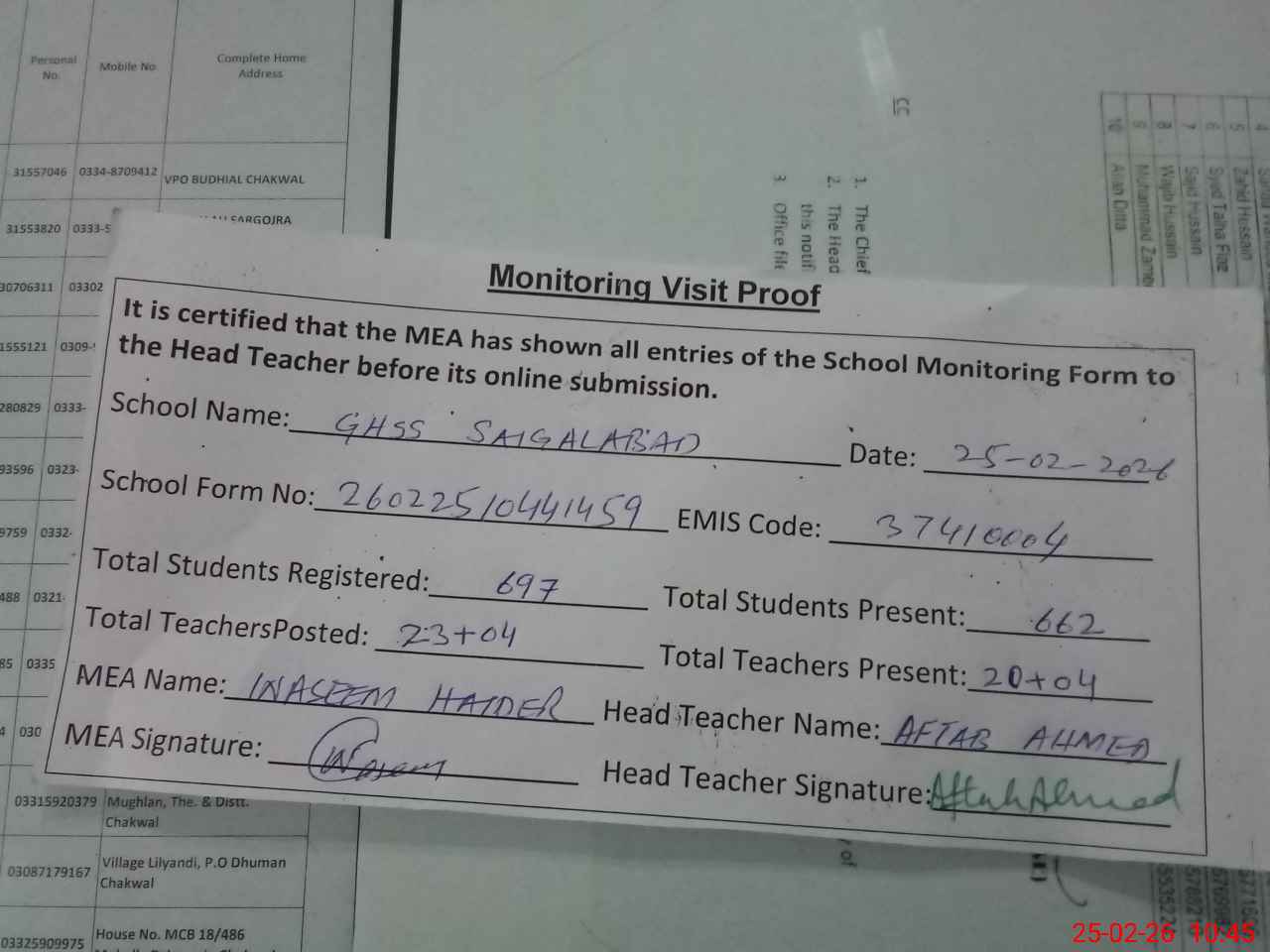 | Attendance Register | Head Teacher | MEA with School | Visit Proof |