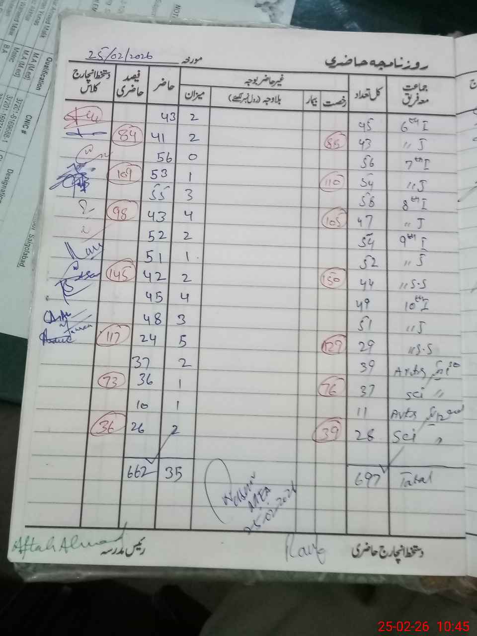 | Remarks (Use Separate Page if Required): Class 8 four students found absent for many days but show in roznamcha and were not present | |||||