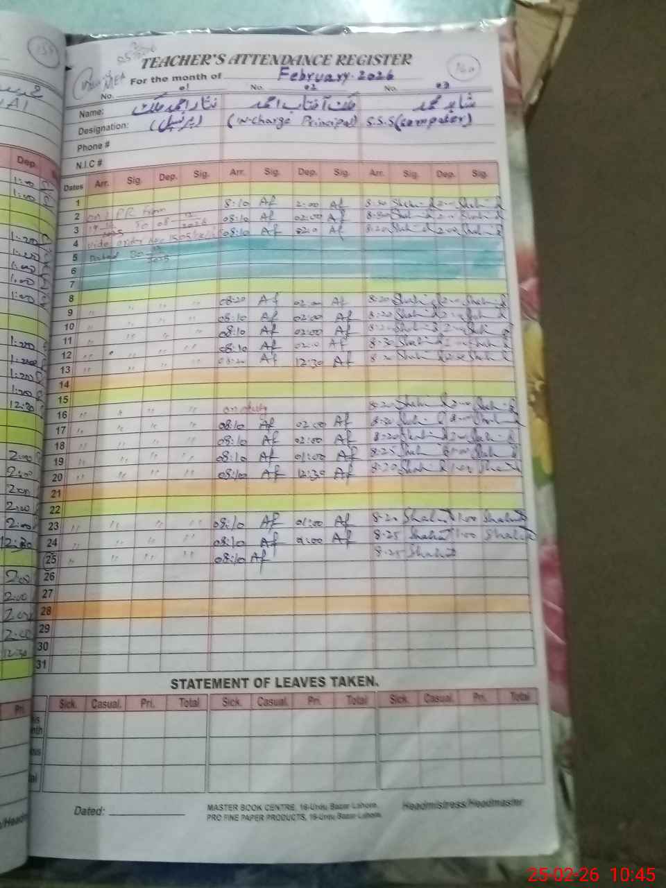 | CNIC | Full Name | Designation | R/C | Absence During Last Calender Month |