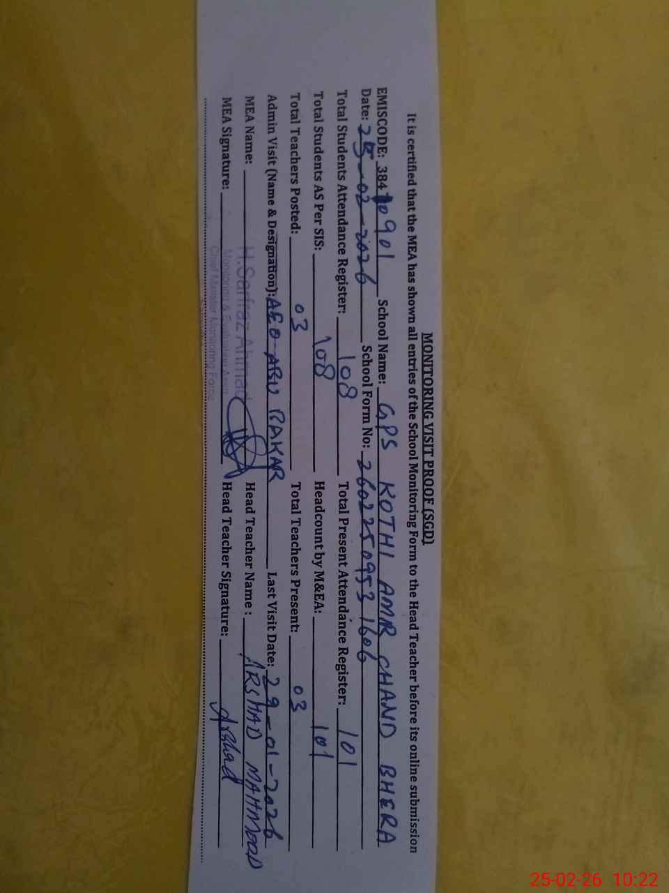 | EMIS Code: 38410901 | Name of School: GPS KOTHI AMIR CHAND, BHERA | |||