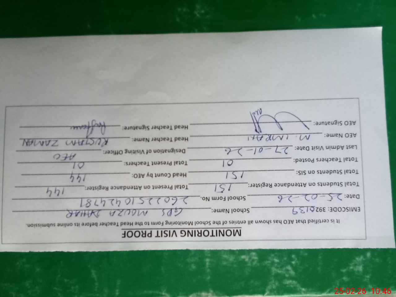 | Certified that this School was Inspected by the Undersigned MEA/DMO Today and the Information Stated Above is as Per Record. | |||||