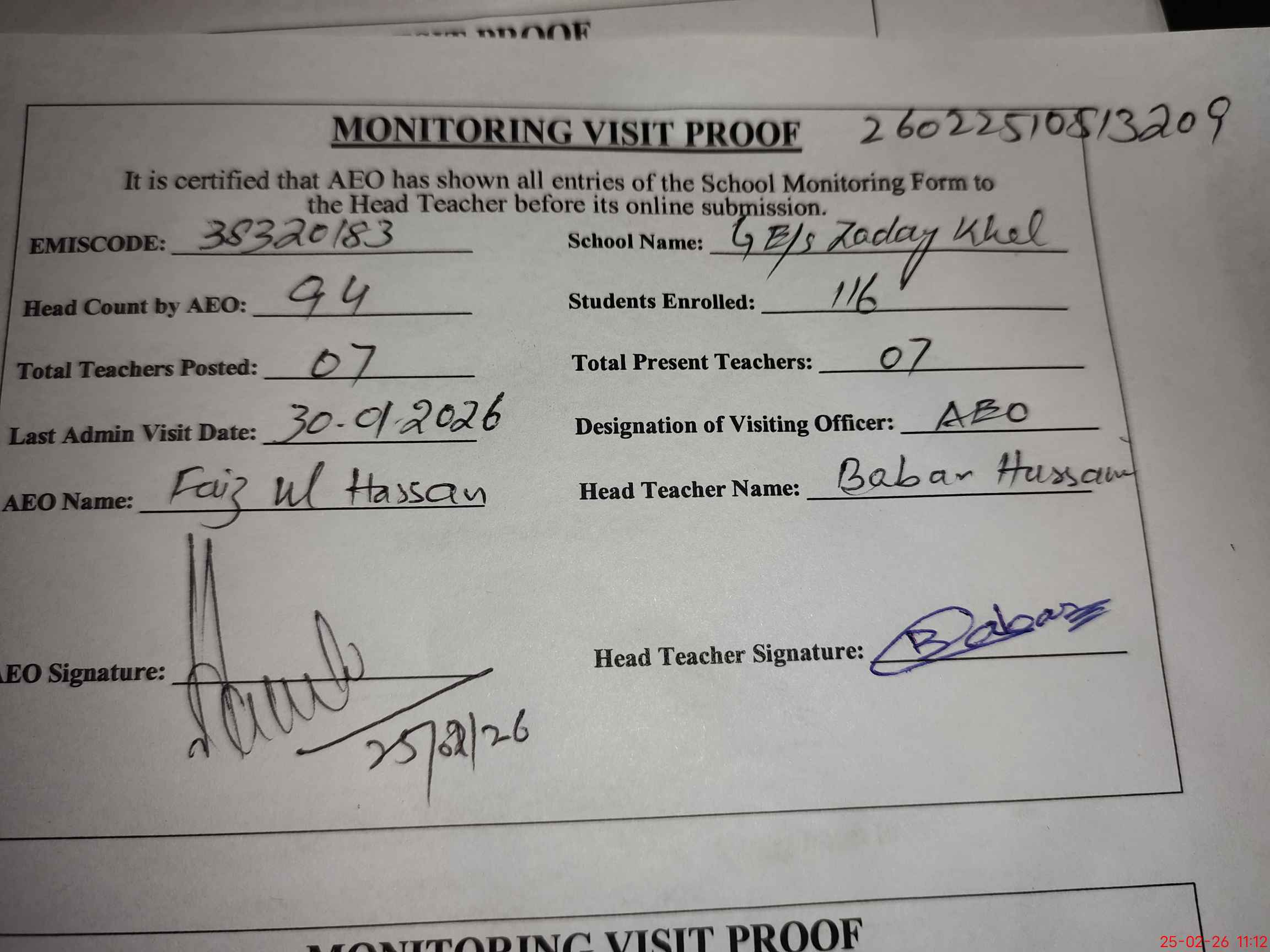 | Certified that this School was Inspected by the Undersigned MEA/DMO Today and the Information Stated Above is as Per Record. | |||||