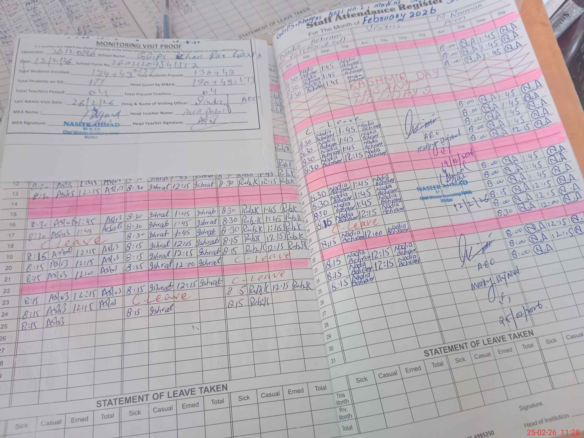 | Attendance Register | Head Teacher | MEA with School | Visit Proof |