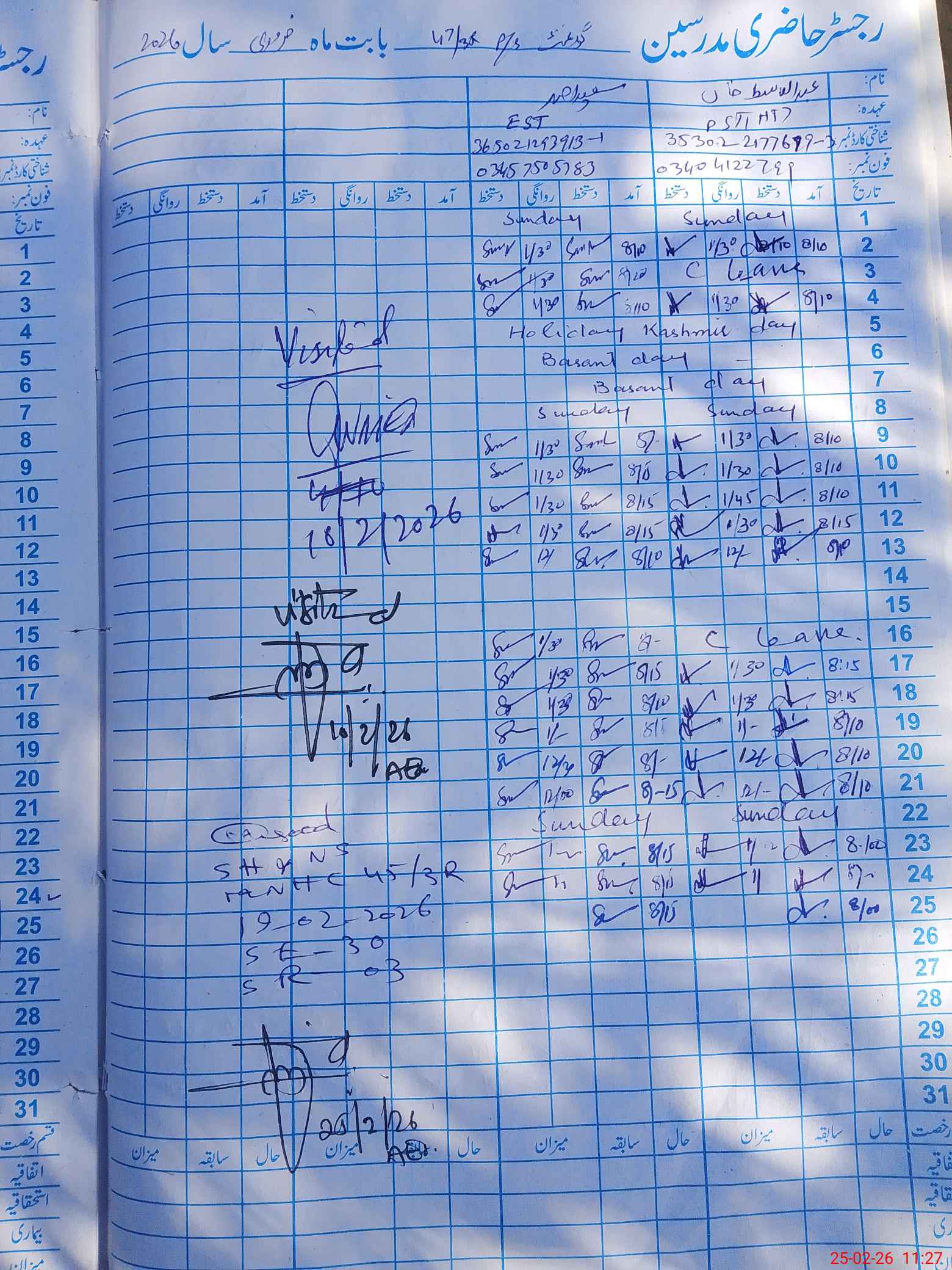 | CNIC | Full Name | Designation | R/C | Absence During Last Calender Month |