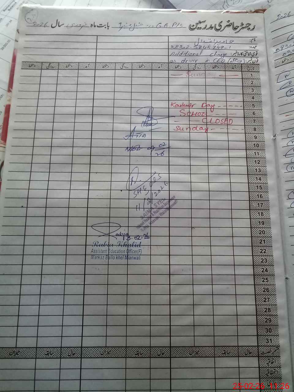 | Name: Iz**** Ha**** Designation: (School Headmaster's/Headmistress's) PST Phone/Cell Number: 03**** |