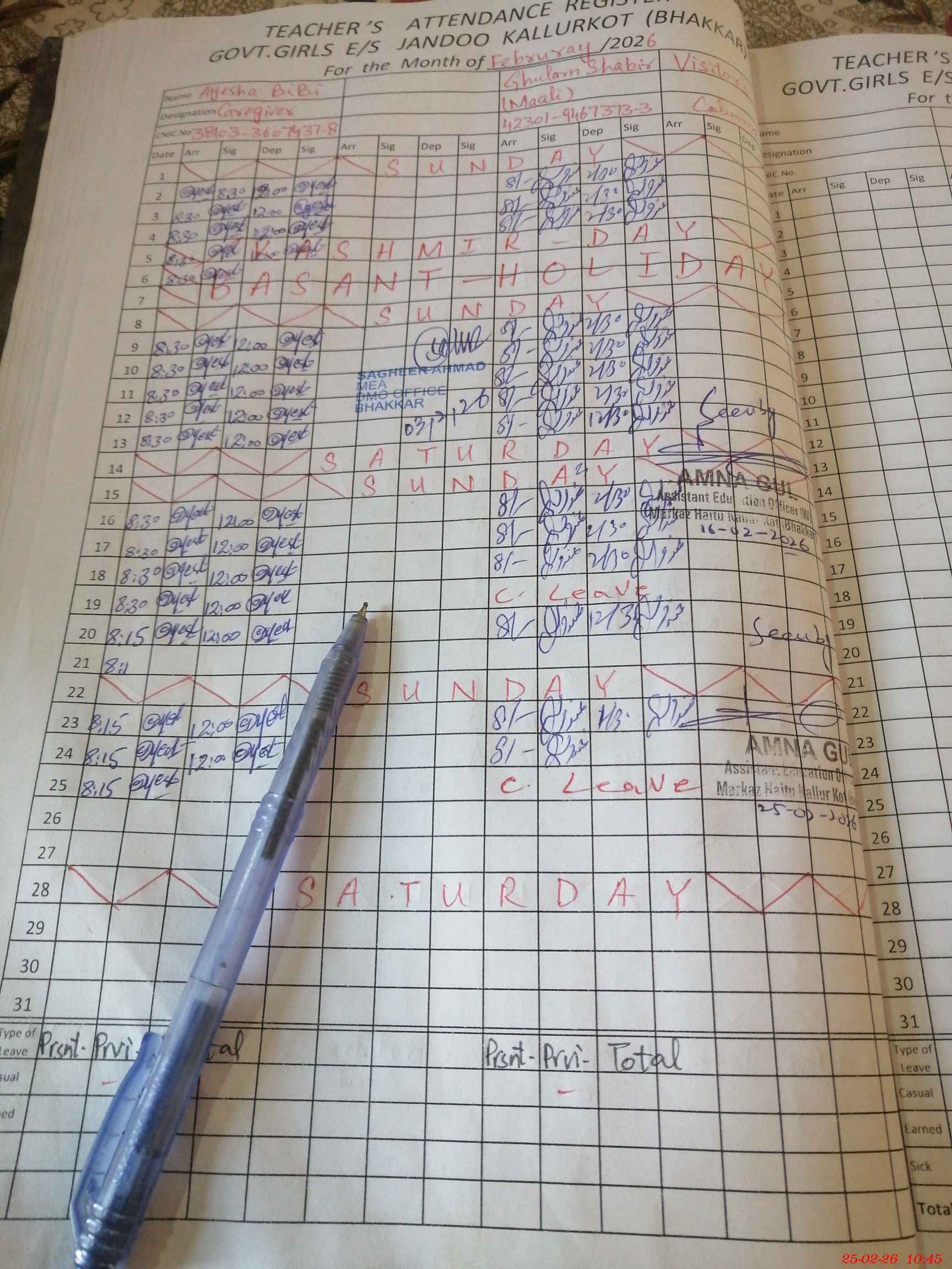 | CNIC | Full Name | Designation | R/C | Absence during last cal. month |