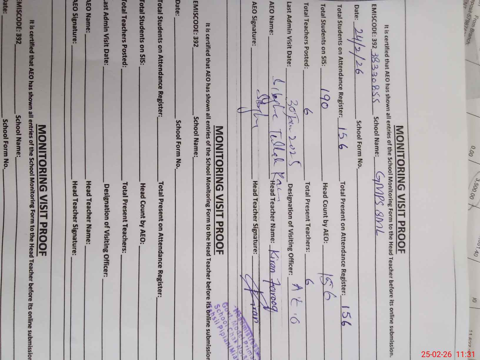 | EMIS Code: 38330855 | Name of School: GMPS CHAK NO 8 ML PIPLAN | |||