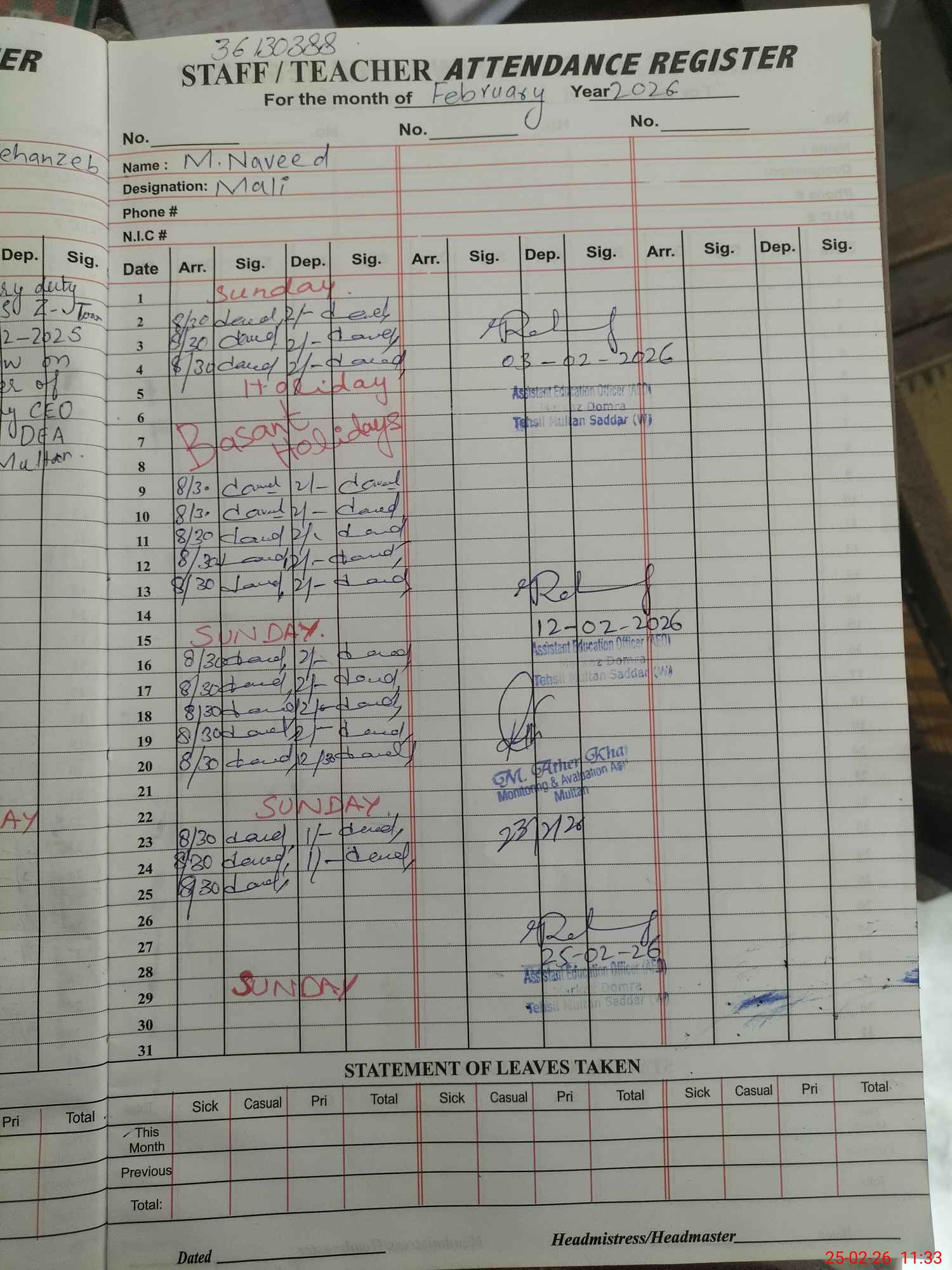 | Attendance Register | Head Teacher | MEA with School | Visit Proof |