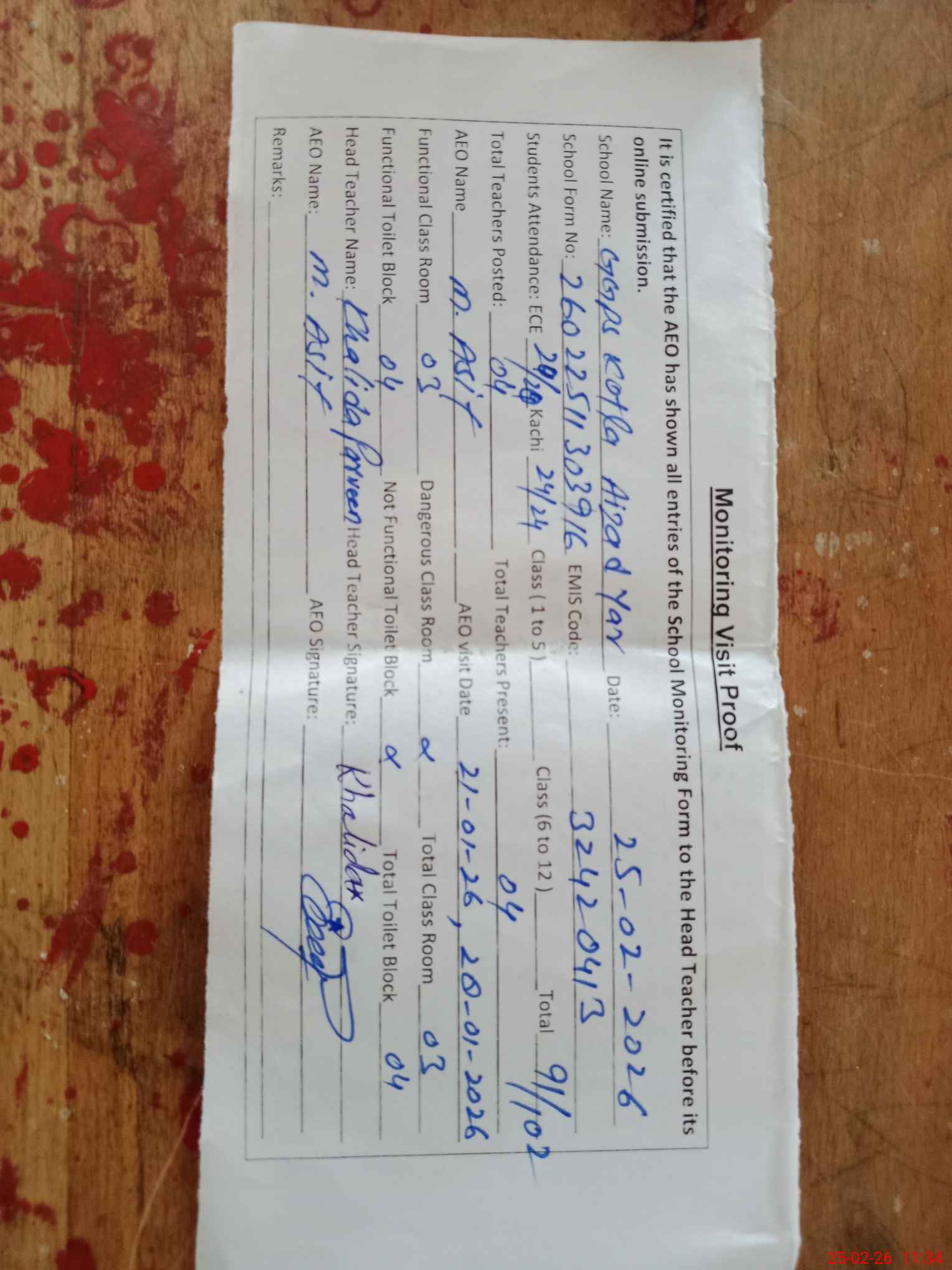 | Attendance Register | Head Teacher | MEA with School | Visit Proof |