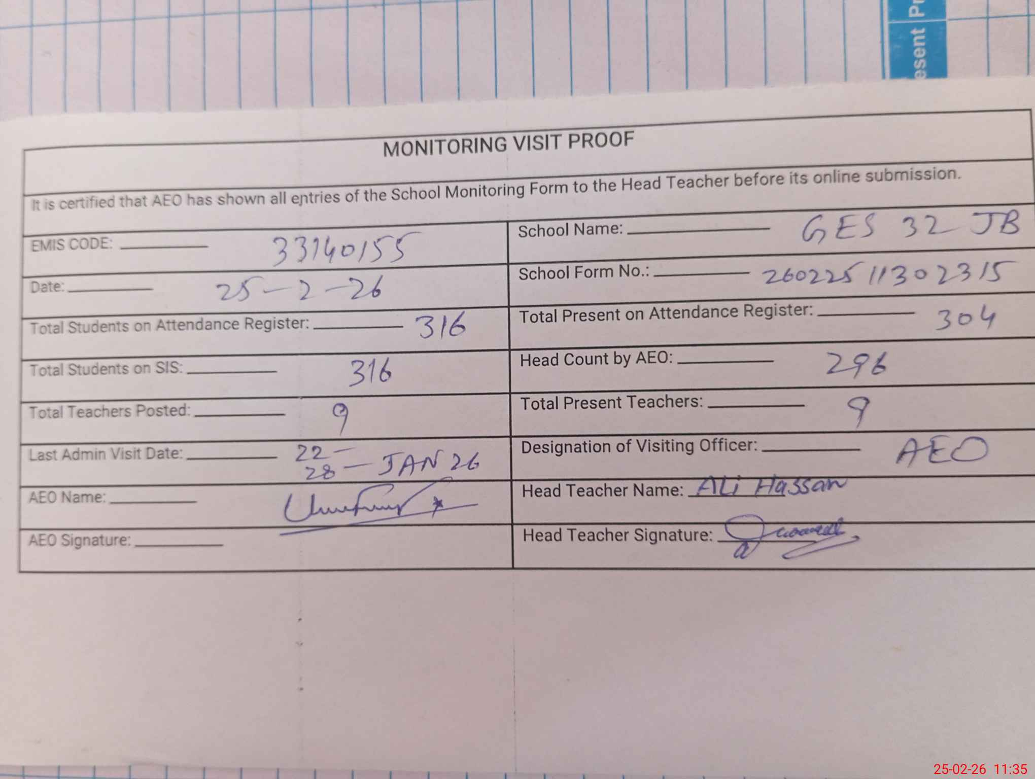 | Attendance Register | Head Teacher | MEA with School | Visit Proof |