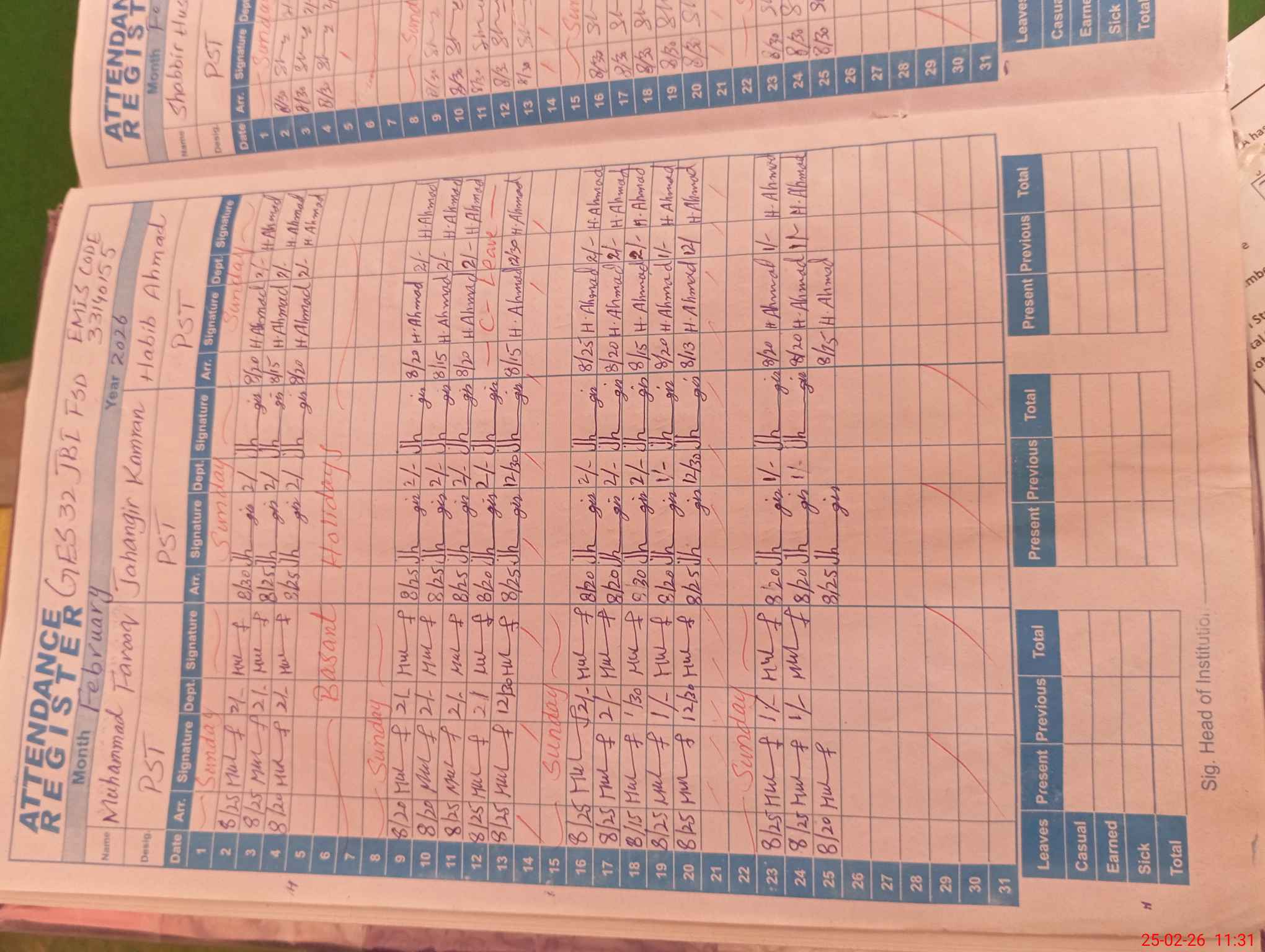 | CNIC | Full Name | Designation | R/C | Absence During Last Calender Month |