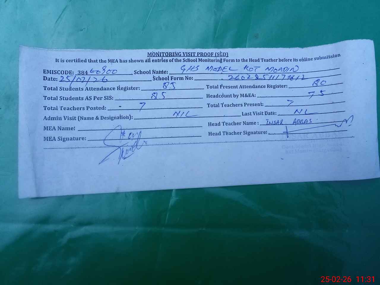 | Attendance Register | Head Teacher | MEA with School | Visit Proof |