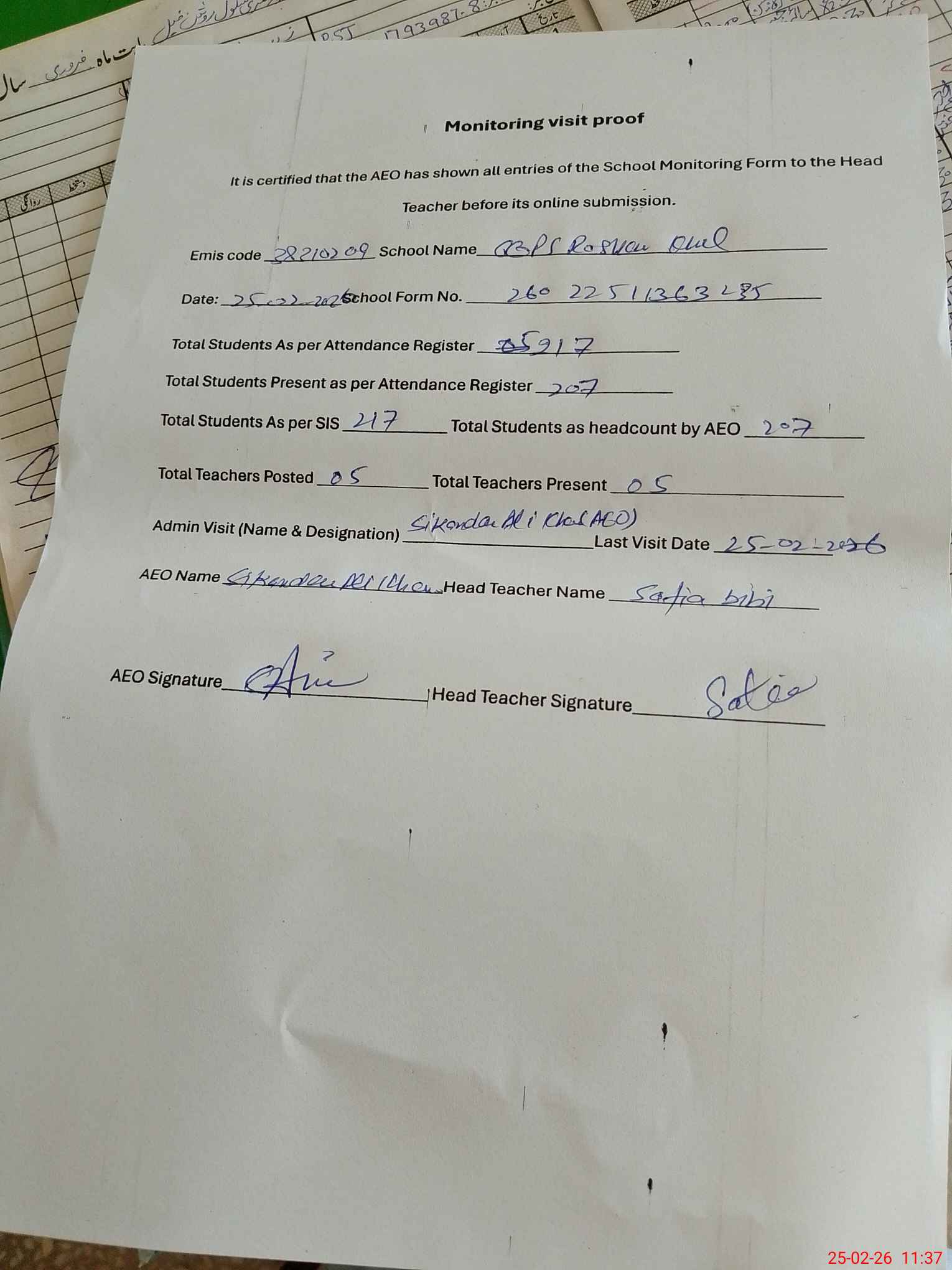 | Attendance Register | Head Teacher | MEA with School | Visit Proof |