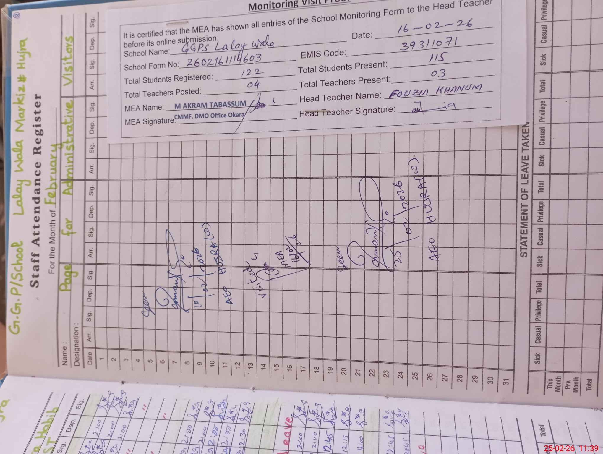 | EMIS Code: 39311071 | Name of School: GGPS LALAY WALA | |||