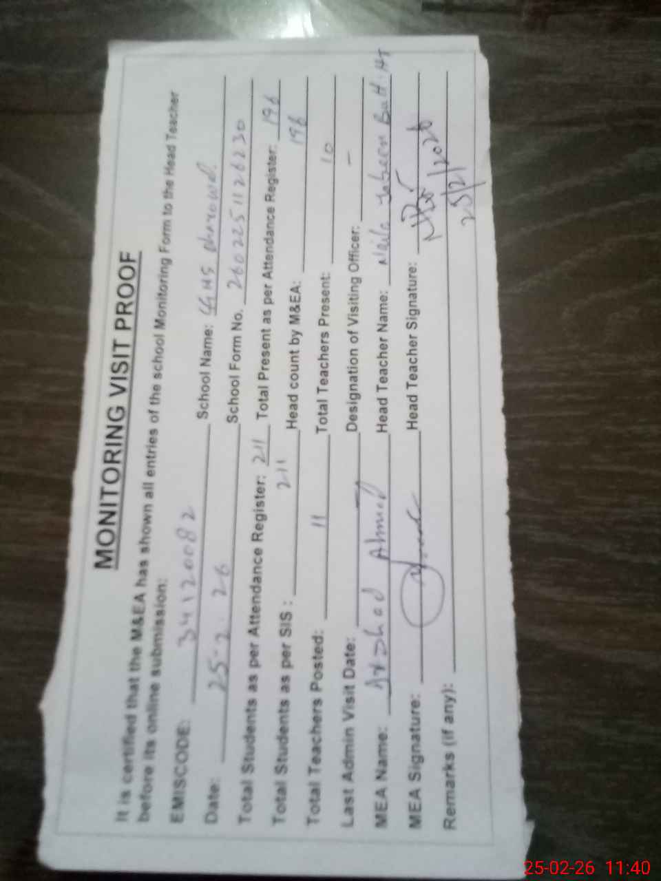| Attendance Register | Head Teacher | MEA with School | Visit Proof |