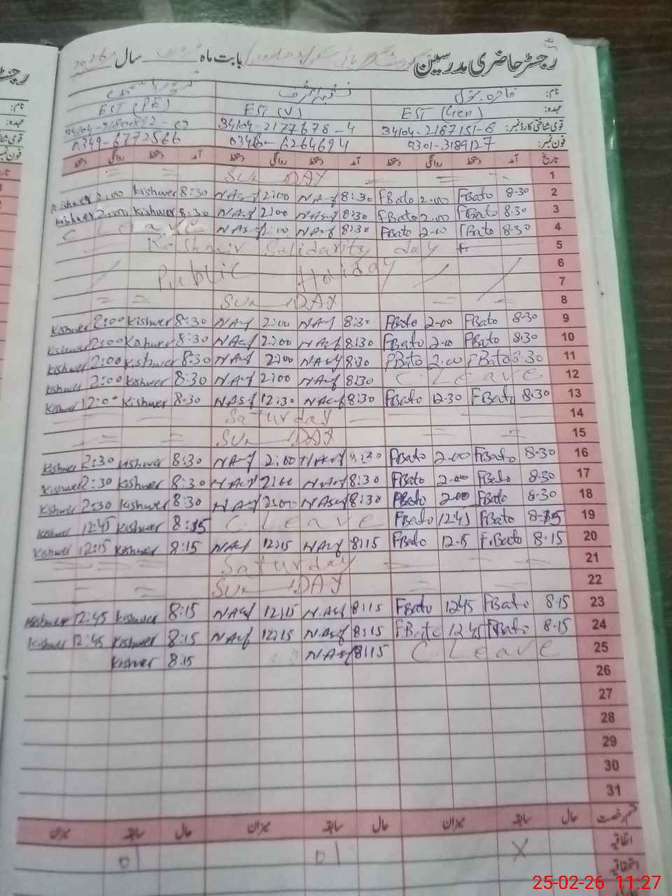 | CNIC | Full Name | Designation | R/C | Absence During Last Calender Month |