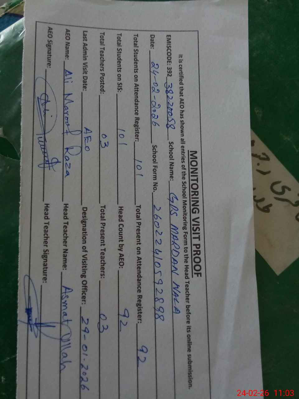 | EMIS Code: 38220058 | Name of School: GPS MARDAN WALA | |||