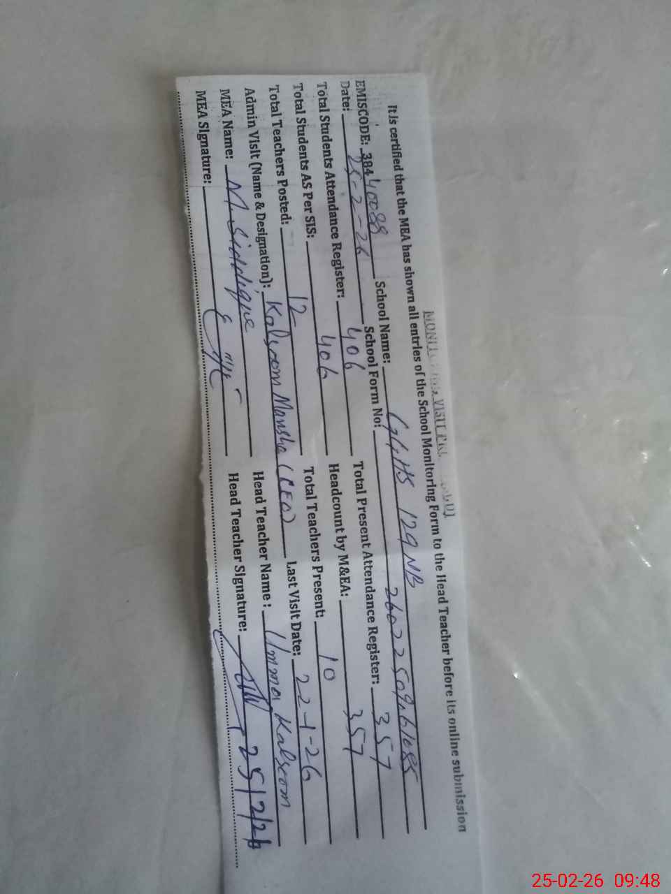 | Attendance Register | Head Teacher | MEA with School | Visit Proof |