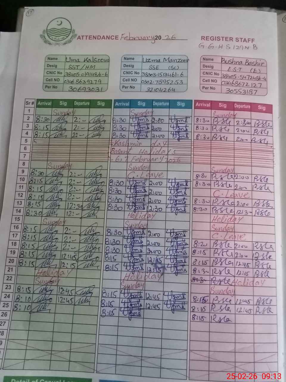| CNIC | Full Name | Designation | R/C | Absence during last cal. month |