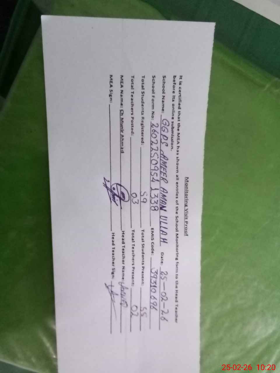 | Attendance Register | Head Teacher | MEA with School | Visit Proof |