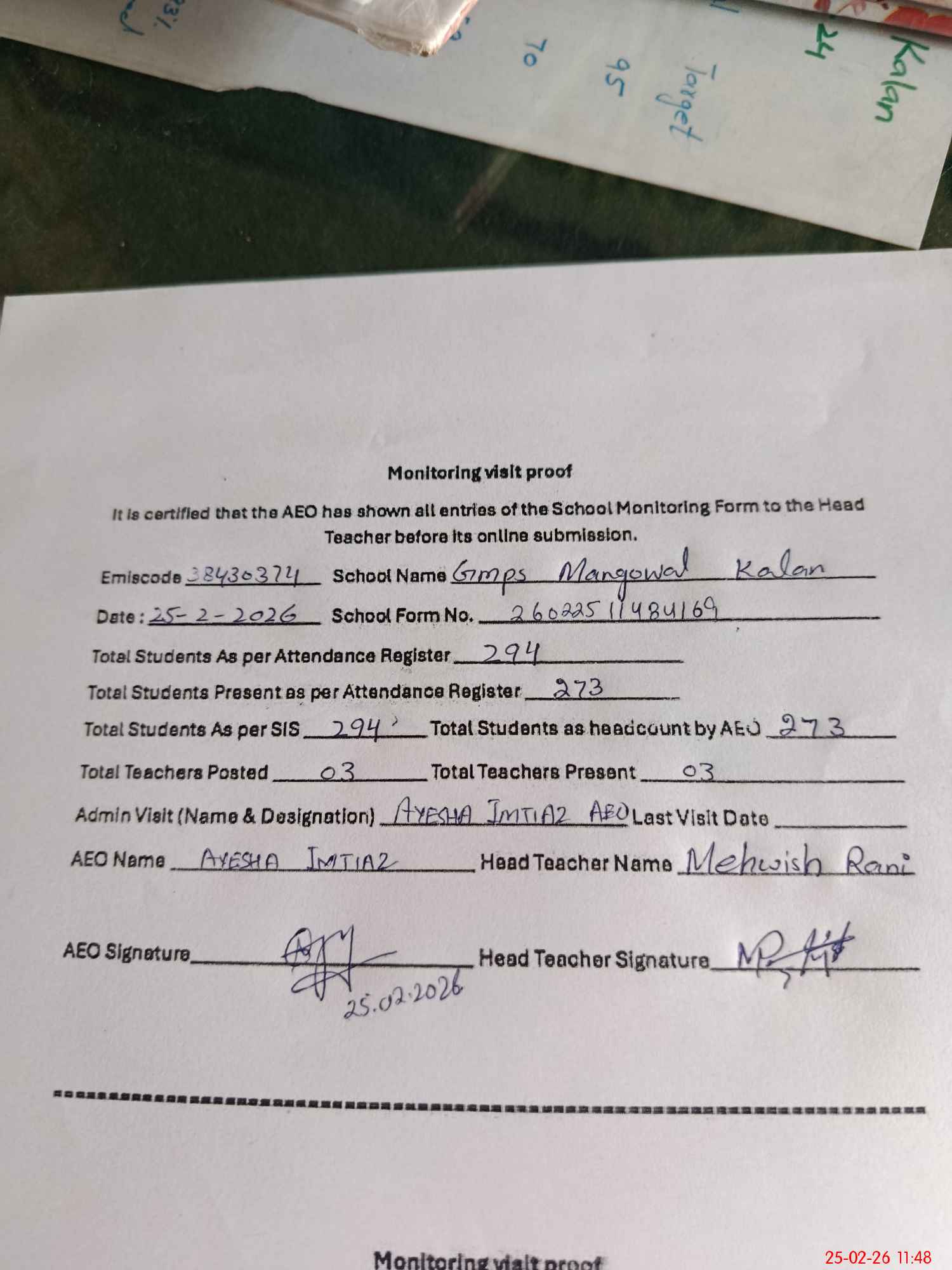 | Attendance Register | Head Teacher | MEA with School | Visit Proof |