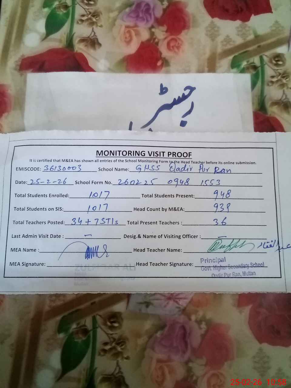 | EMIS Code: 36130003 | Name of School: GHSS QADIR PUR RAN MULTAN | |||