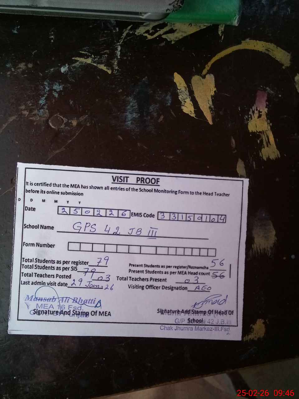 | Attendance Register | Head Teacher | MEA with School | Visit Proof |