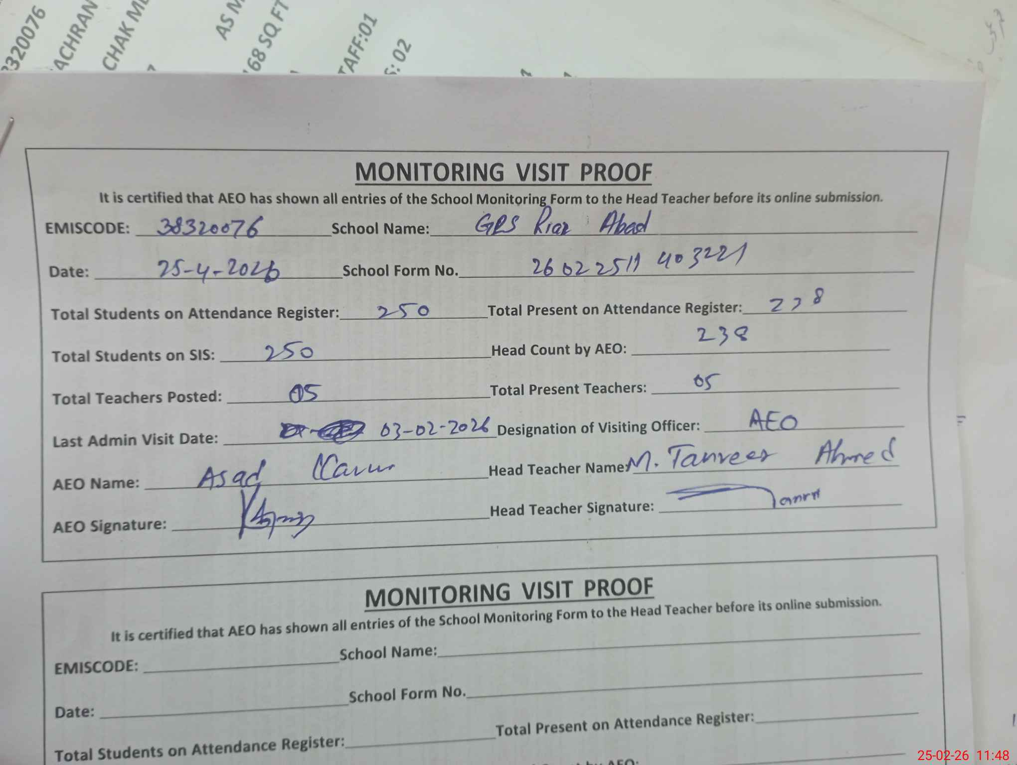 | Attendance Register | Head Teacher | MEA with School | Visit Proof |