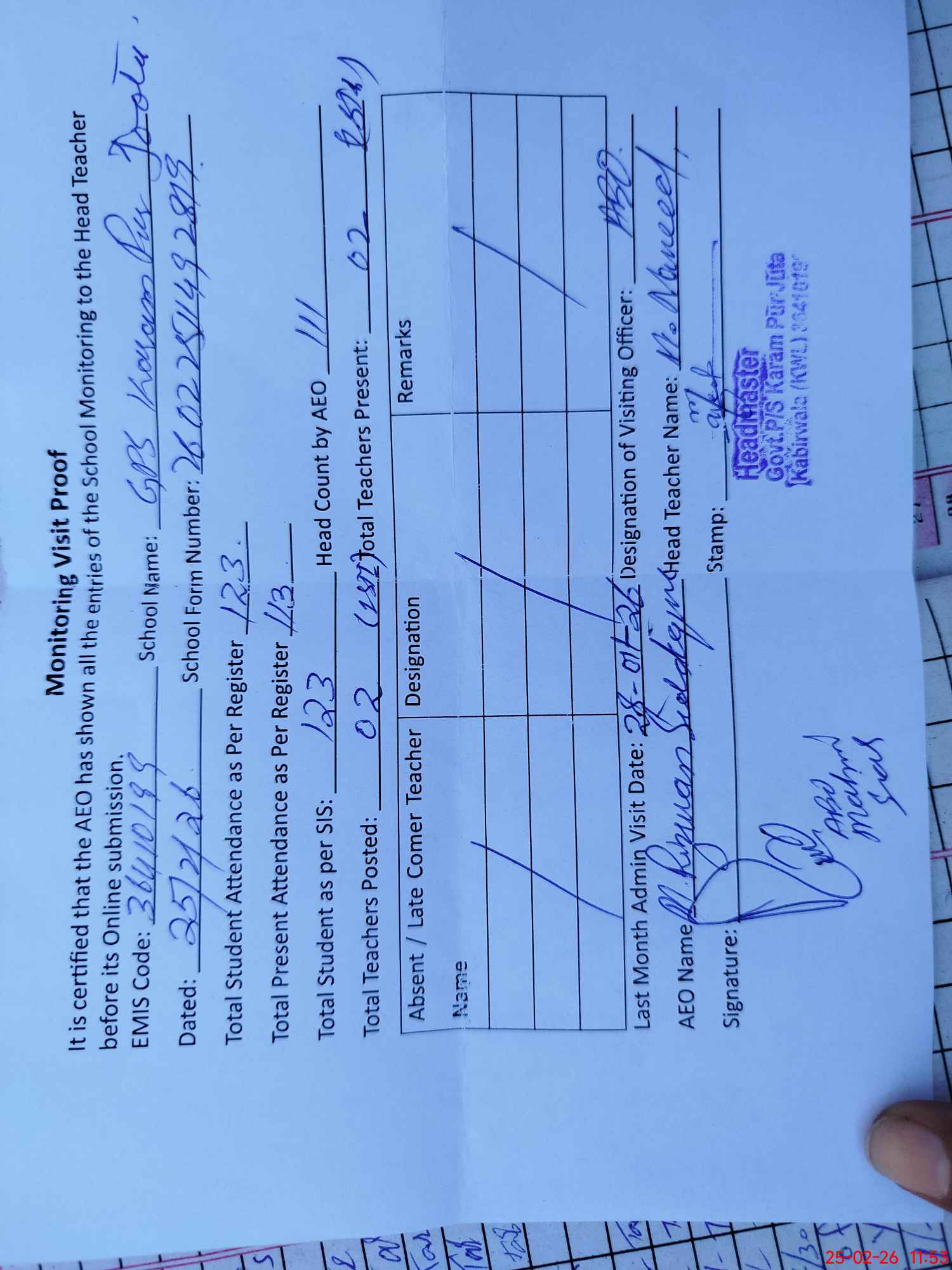 | Attendance Register | Head Teacher | MEA with School | Visit Proof |