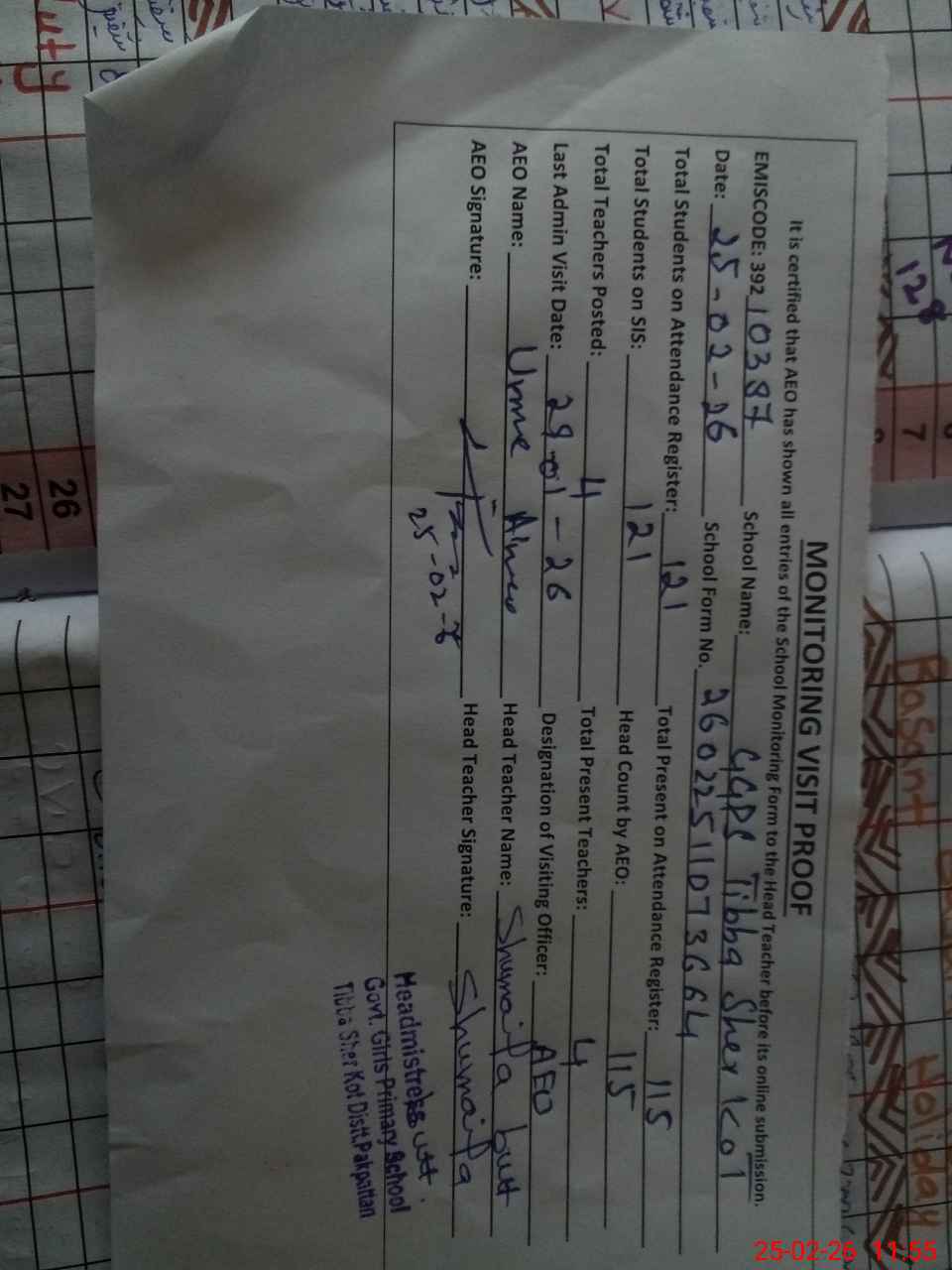 | Attendance Register | Head Teacher | MEA with School | Visit Proof |
