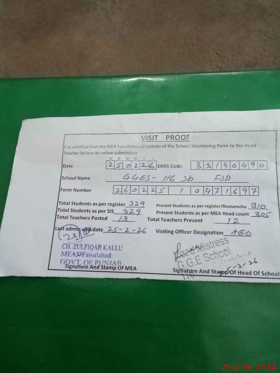 | Attendance Register | Head Teacher | MEA with School | Visit Proof |