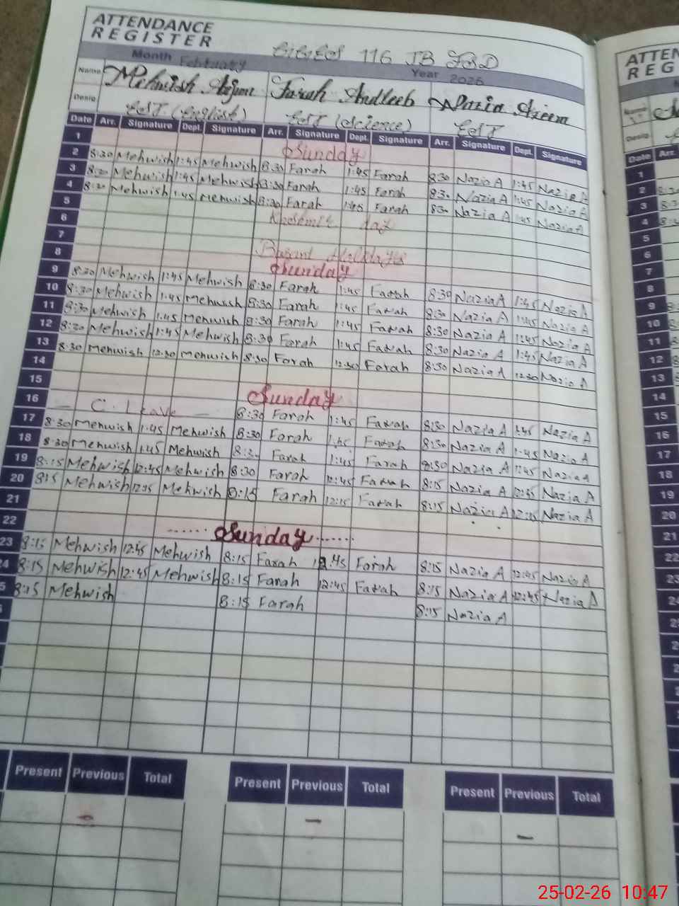 | CNIC | Full Name | Designation | R/C | Absence During Last Calender Month |