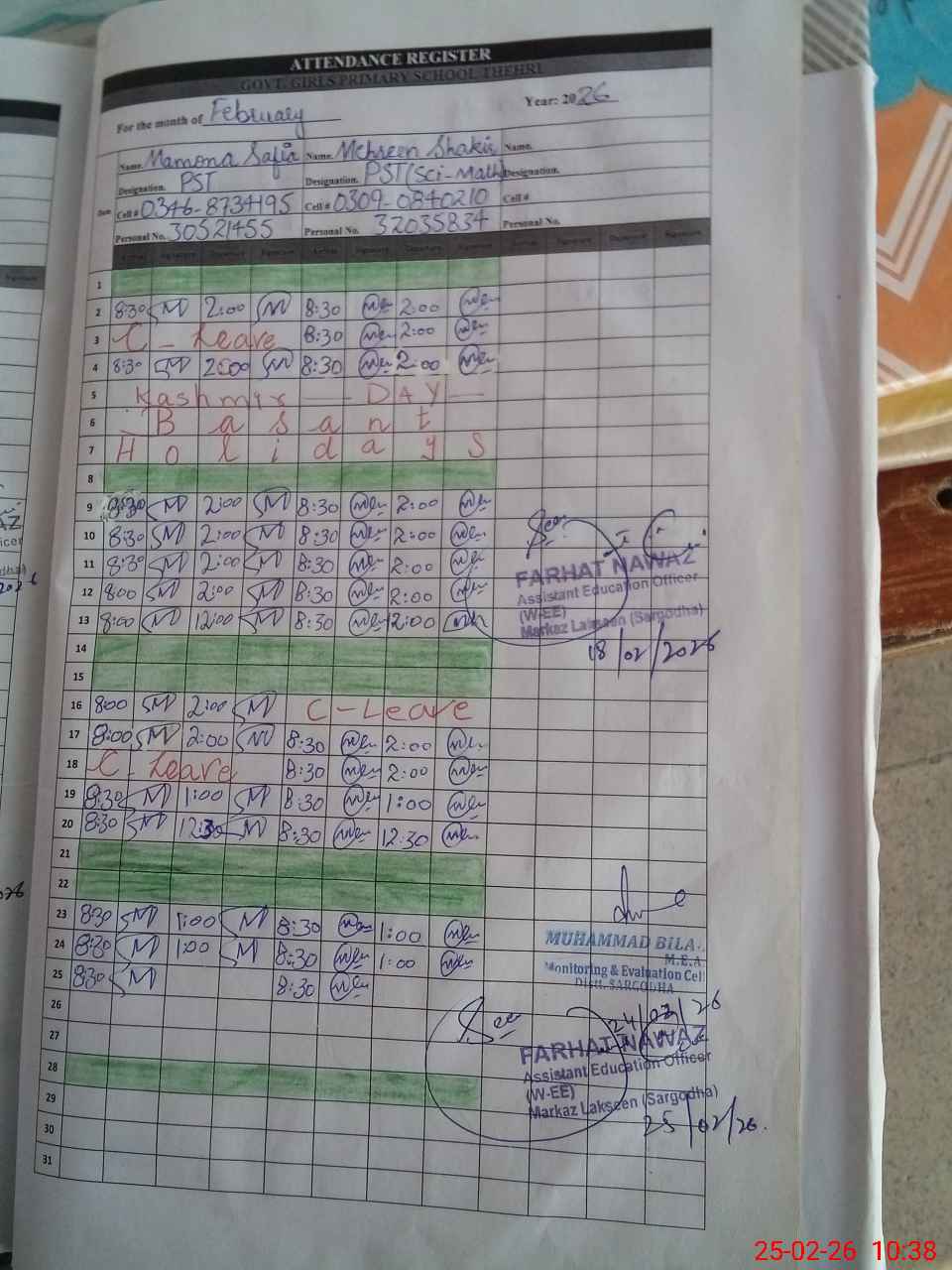 | Name: Ma**** Sa**** Designation: (School Headmaster's/Headmistress's) PST Phone/Cell Number: 03**** |