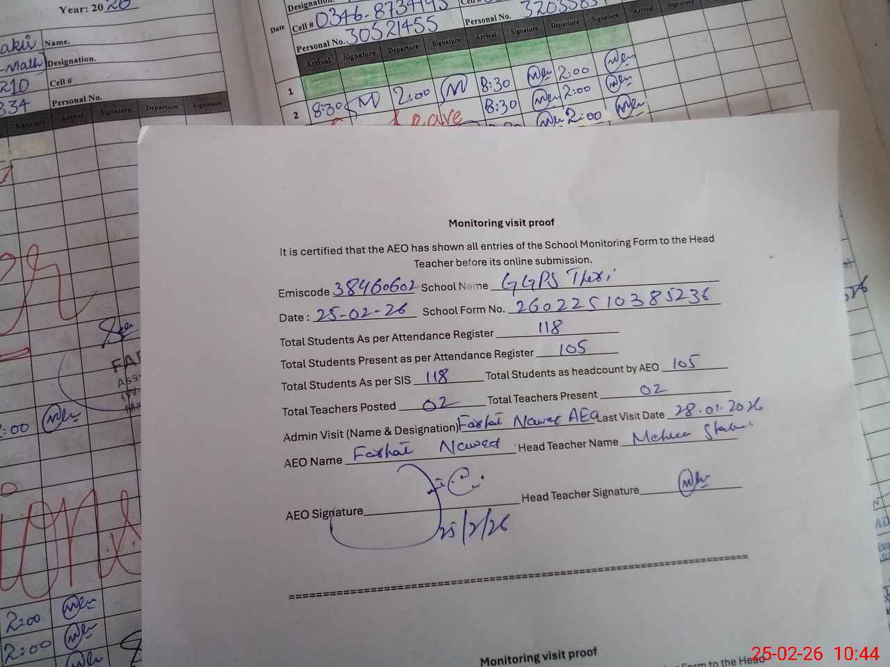 | Attendance Register | Head Teacher | MEA with School | Visit Proof |