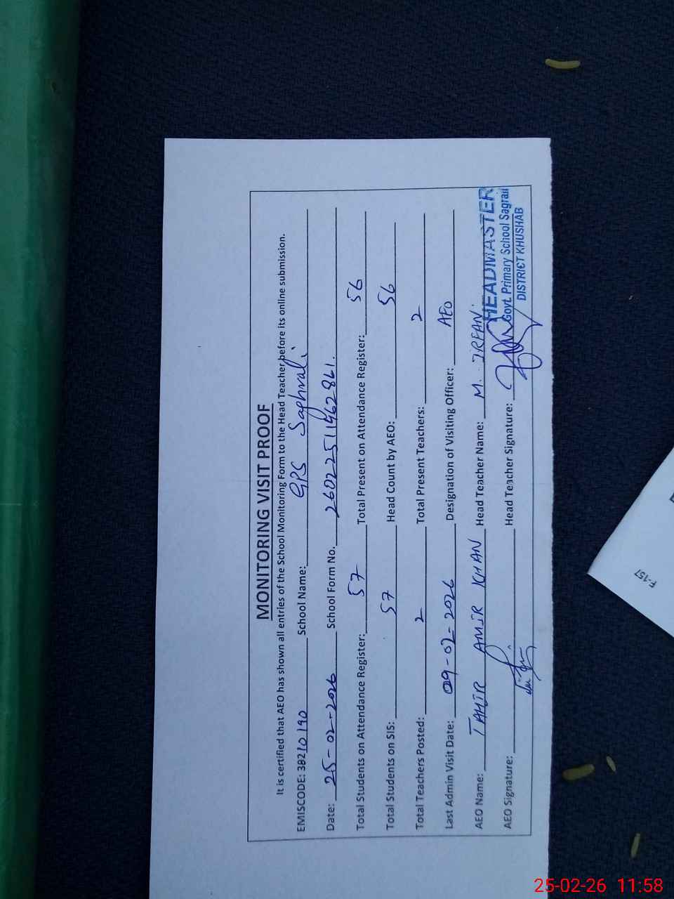 | Attendance Register | Head Teacher | MEA with School | Visit Proof |