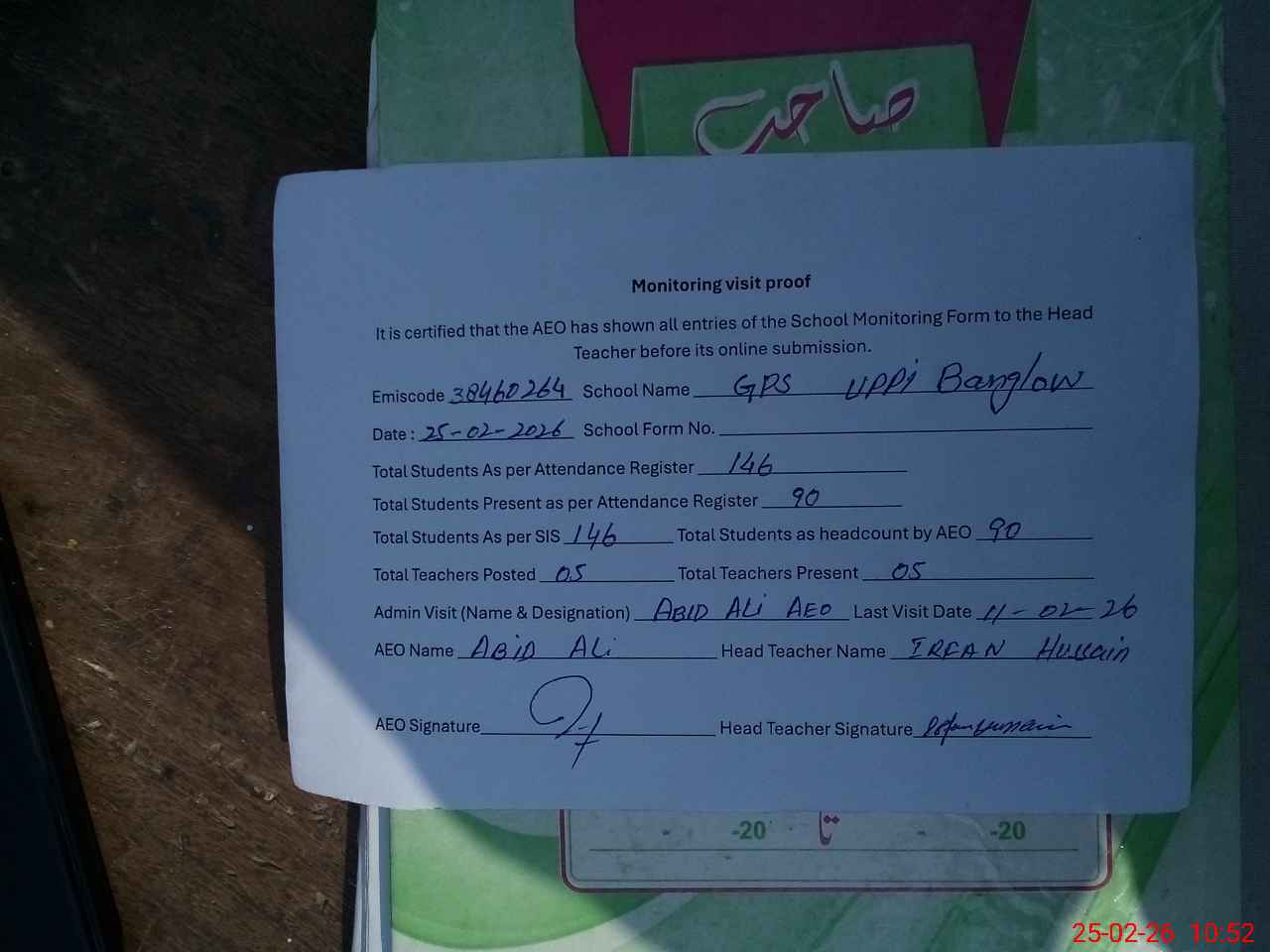 | EMIS Code: 38460264 | Name of School: GPS UPPI BANGLOW | |||