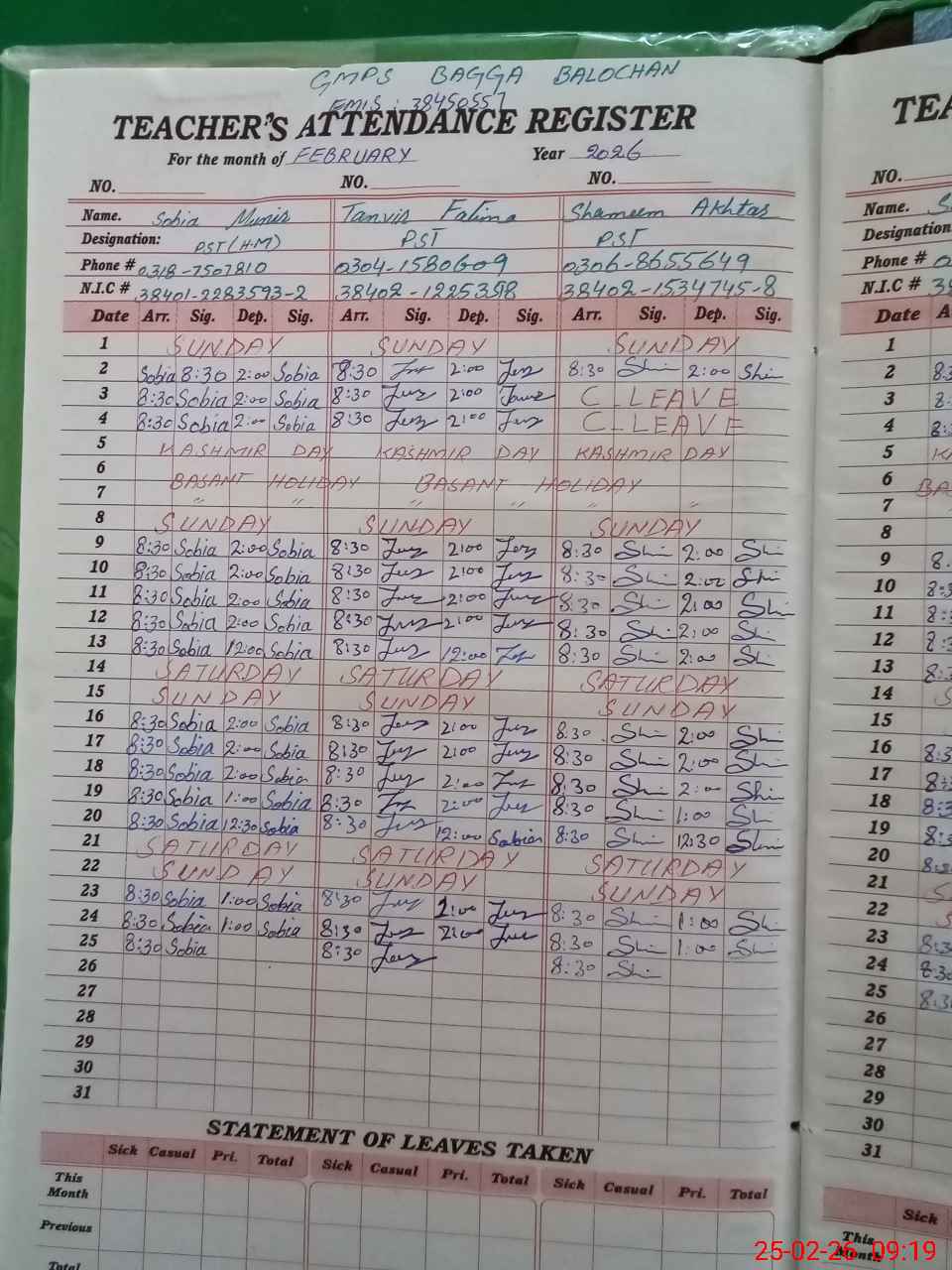 | CNIC | Full Name | Designation | R/C | Absence During Last Calender Month |