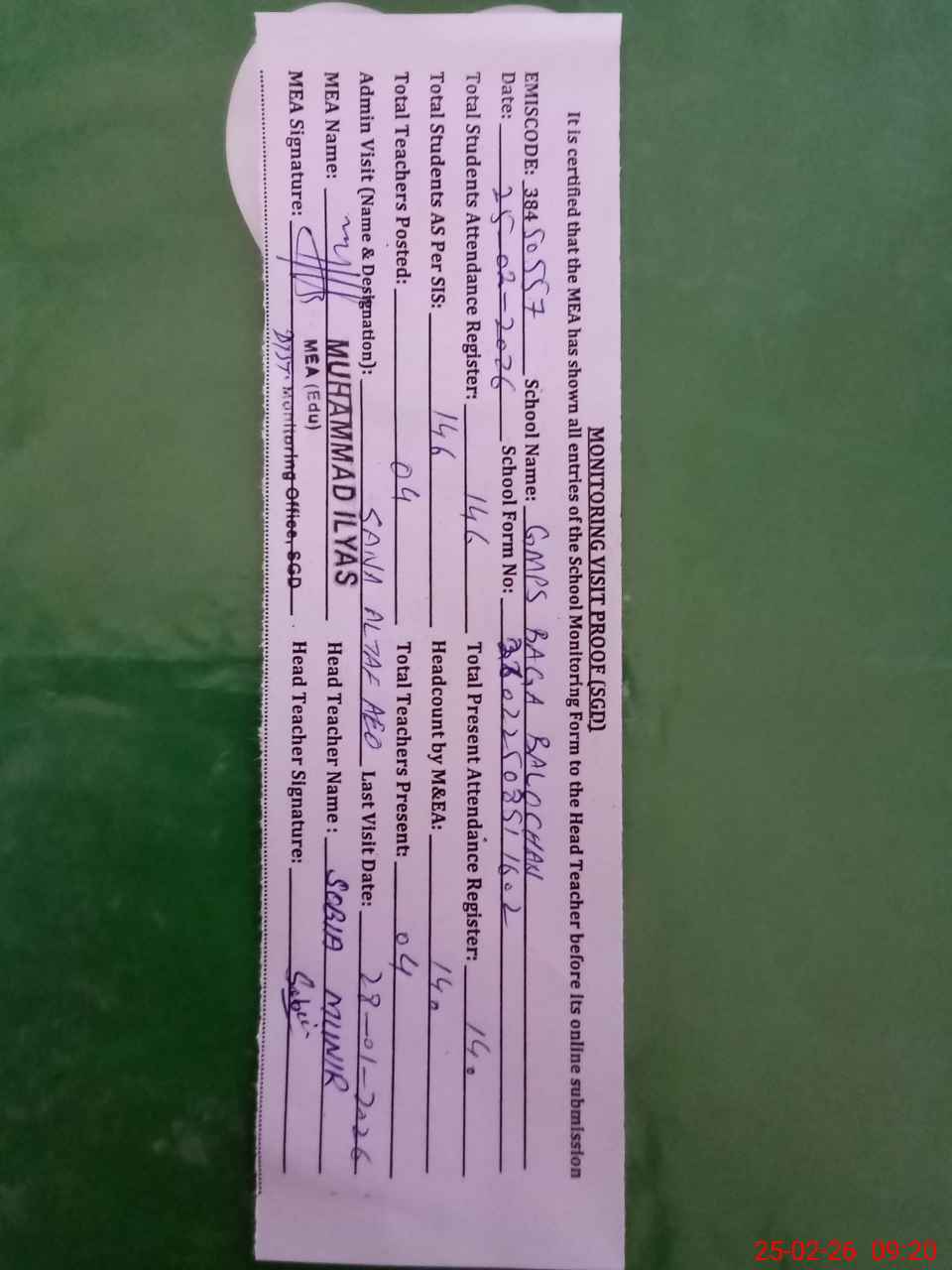 | Attendance Register | Head Teacher | MEA with School | Visit Proof |