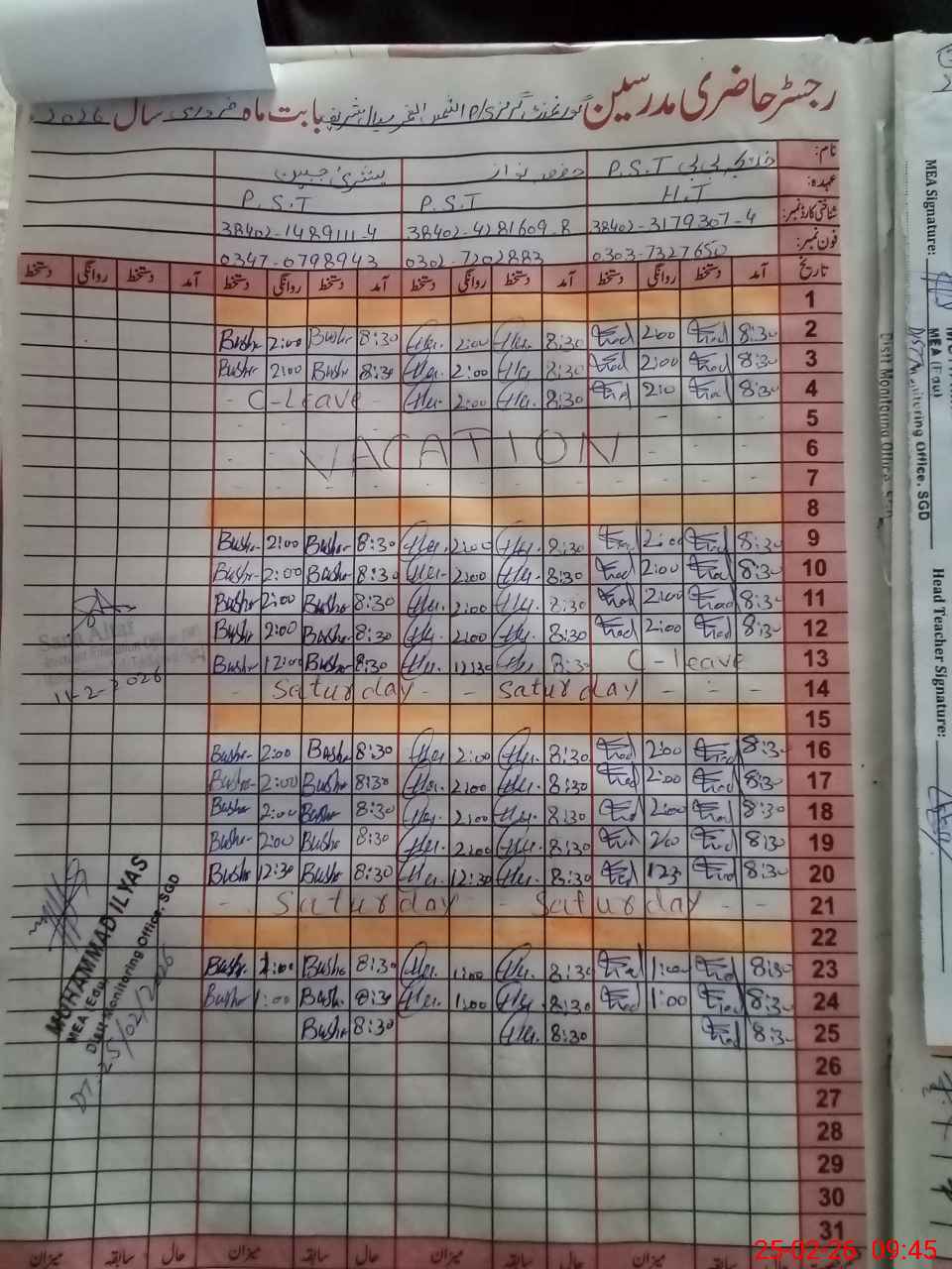 | Name: KH**** BI**** Designation: (School Headmaster's/Headmistress's) PST Phone/Cell Number: 03**** |