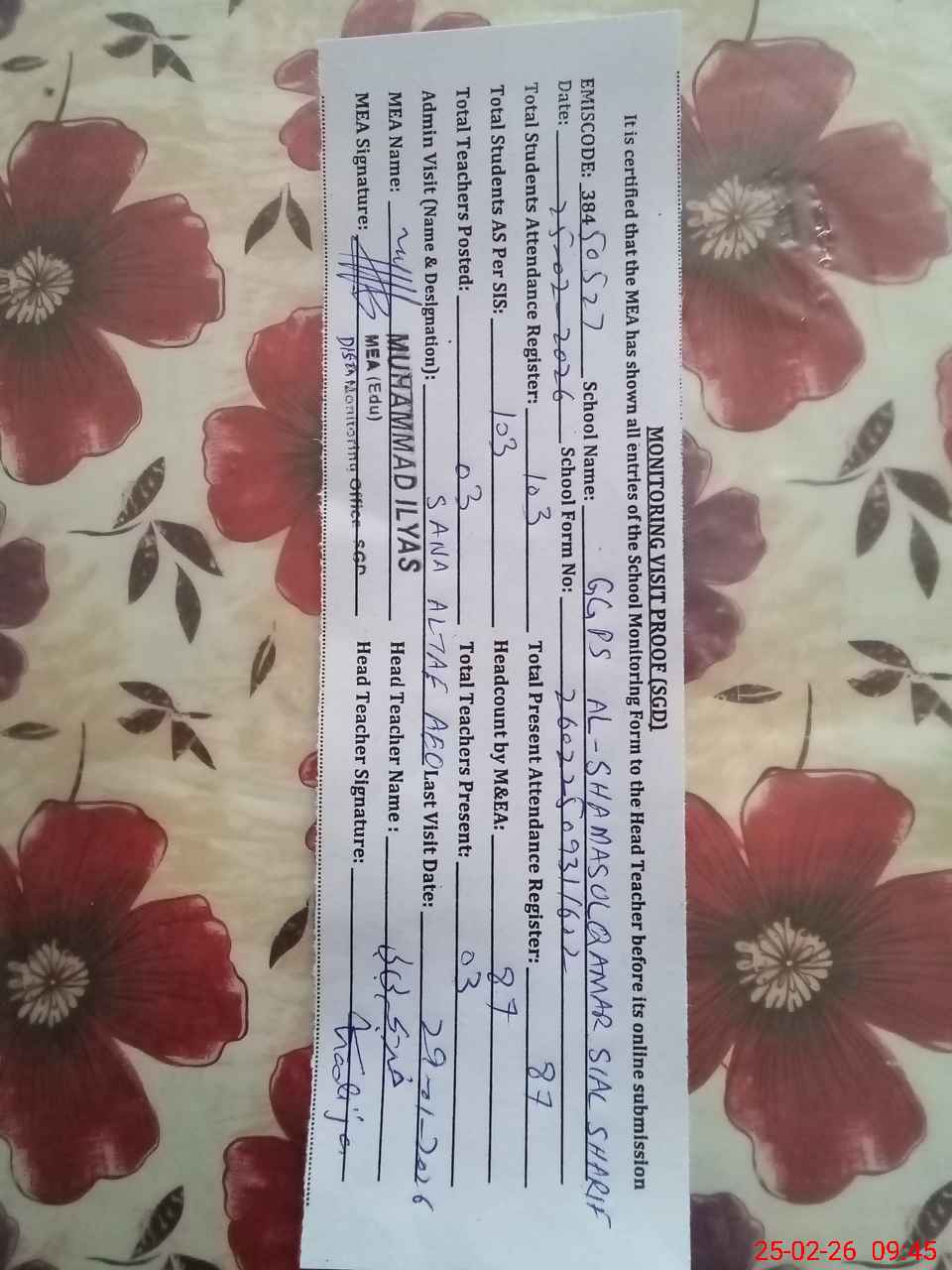 | Attendance Register | Head Teacher | MEA with School | Visit Proof |