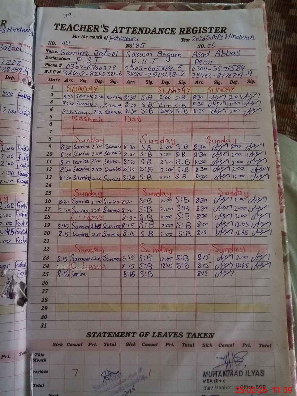 | CNIC | Full Name | Designation | R/C | Absence During Last Calender Month |