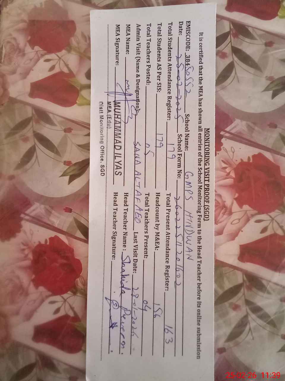 | Attendance Register | Head Teacher | MEA with School | Visit Proof |