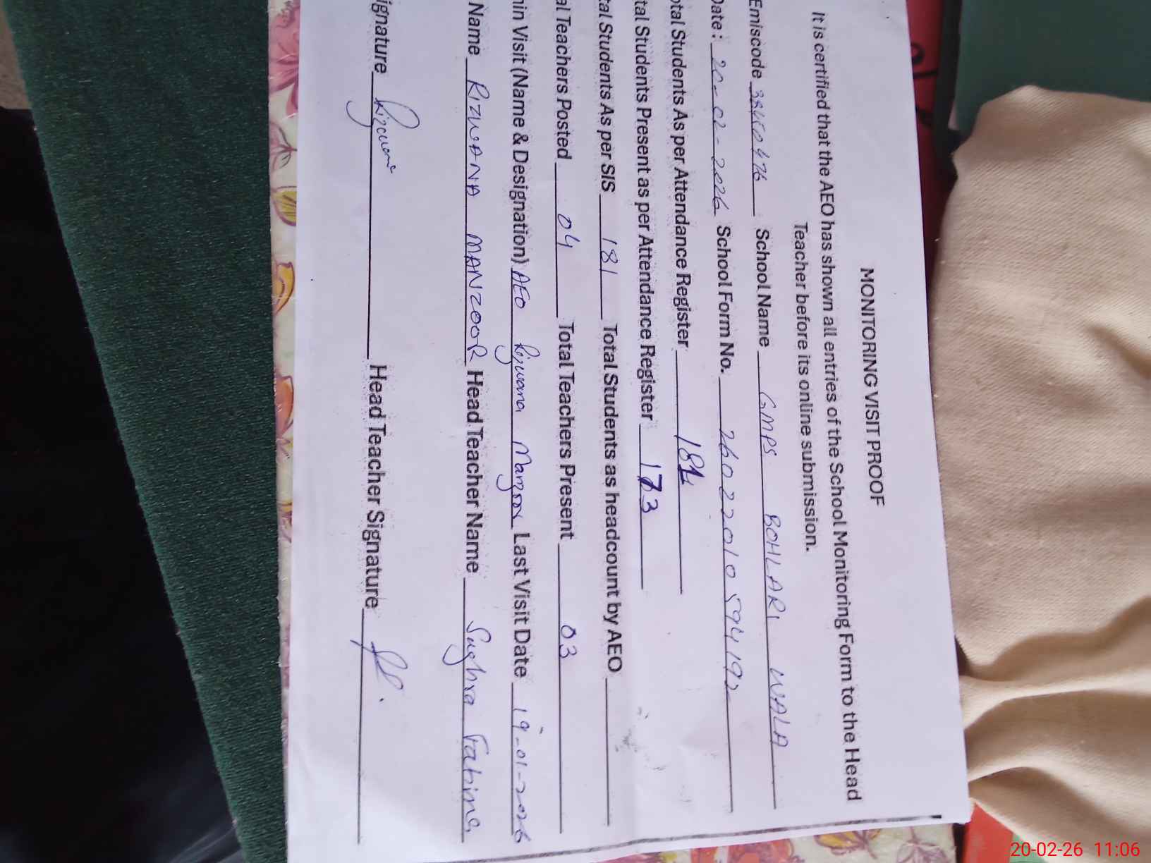 | Attendance Register | Head Teacher | MEA with School | Visit Proof |