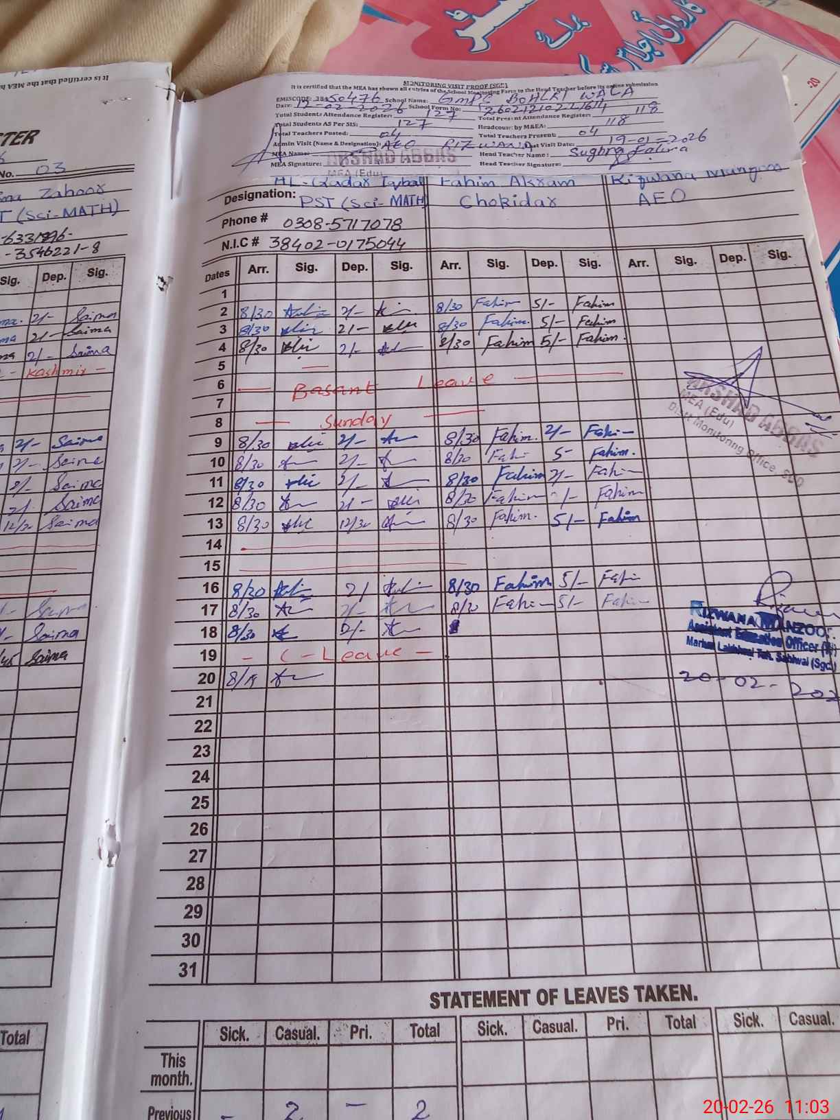 | Name: SU**** FA**** Designation: (School Headmaster's/Headmistress's) PST Phone/Cell Number: 03**** |
