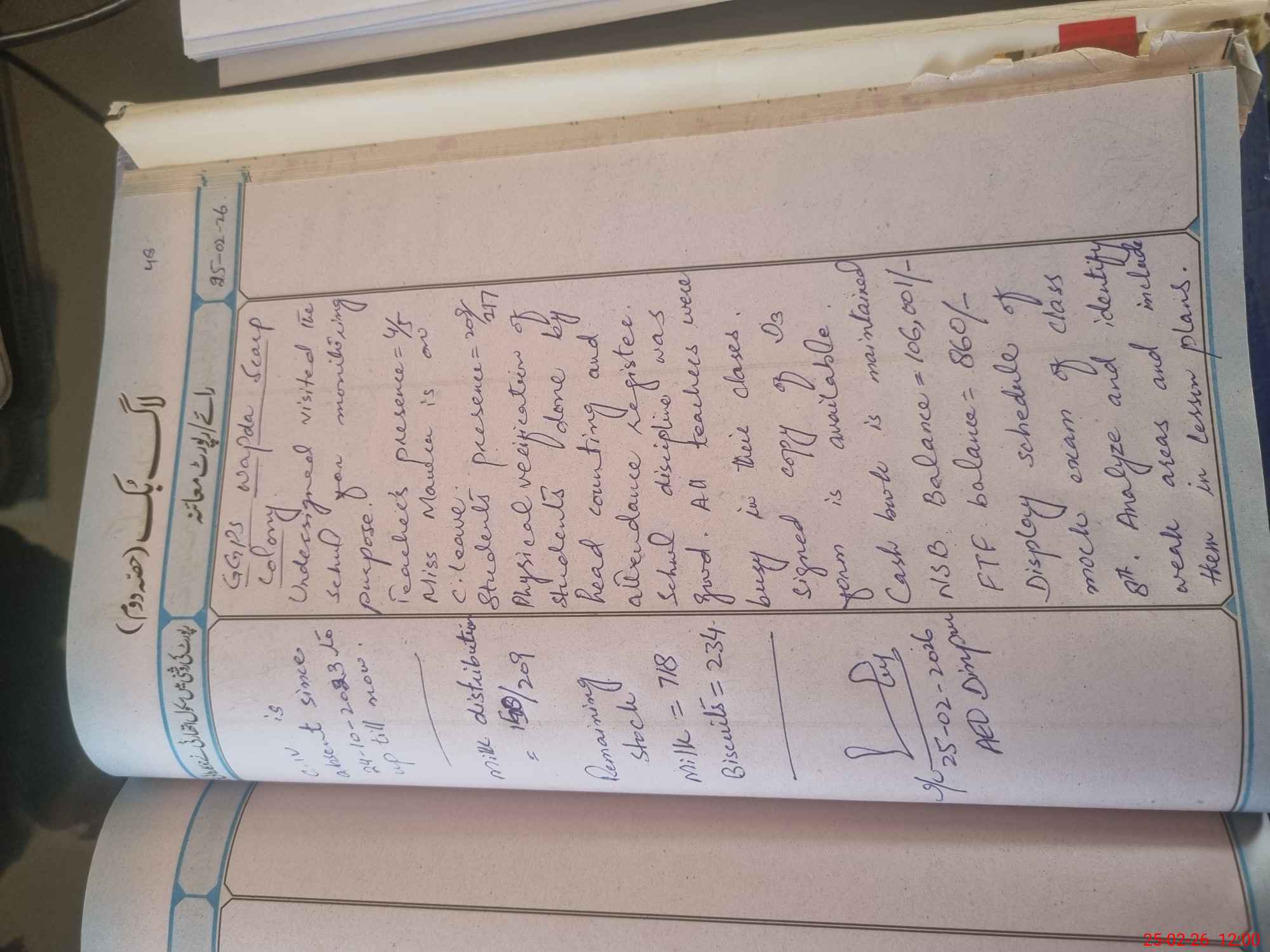 | Total no. of Classrooms: 12 No. of Classrooms Used for Teaching: 11 No. of Classrooms Storing Old Furniture, FTBs, etc: 0Comments if Any: Rooms are small quarter as school is running in wapda colony so in this school all rooms are quarter rooms. And c.iv Rafia maqsood is absent since 24-10-2023. Absent report has been submitted to highups many times. |