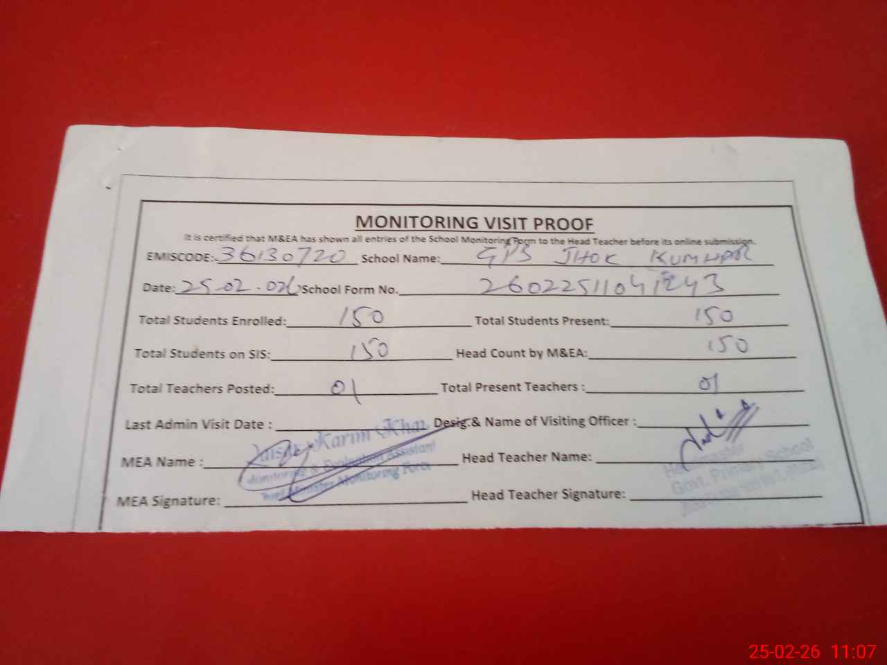 | Attendance Register | Head Teacher | MEA with School | Visit Proof |