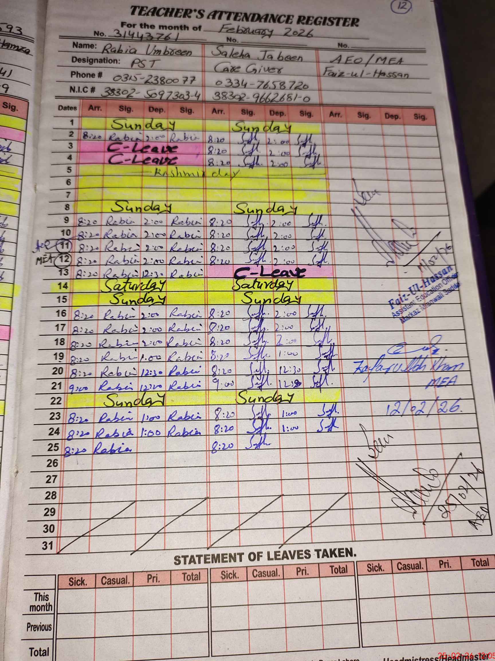 | Name: Me**** Ha**** Kh**** Designation: (School Headmaster's/Headmistress's) PST Phone/Cell Number: 03**** |