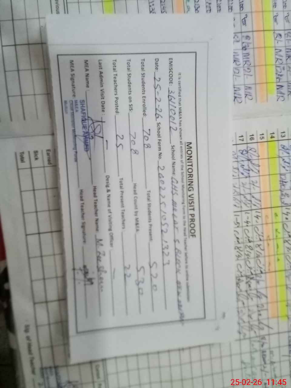 | Certified that this School was Inspected by the Undersigned MEA/DMO Today and the Information Stated Above is as Per Record. | |||||