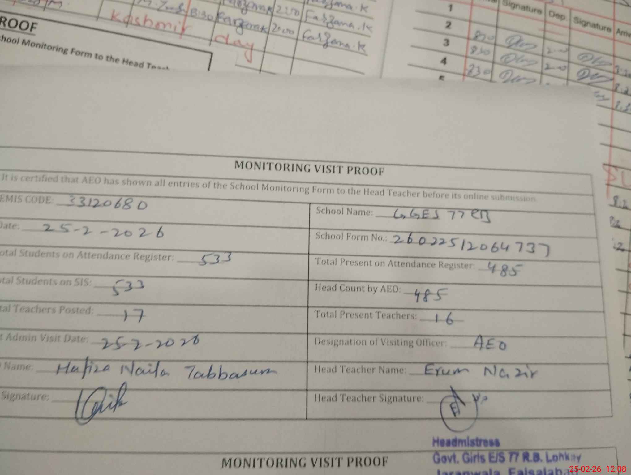 | Attendance Register | Head Teacher | MEA with School | Visit Proof |